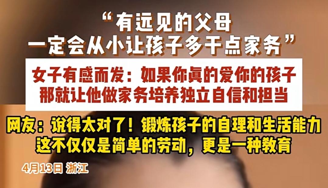 “有远见的父母,一定会从小让孩子多干点家务”, 4月13日,浙江一女子有感而发:如果你真的爱你的孩子,那就让他做家务培养独立自信和担当。网友:说得太对了!锻炼孩子的自理和生活能力,这不仅仅是简单的劳动,更是一种教育。