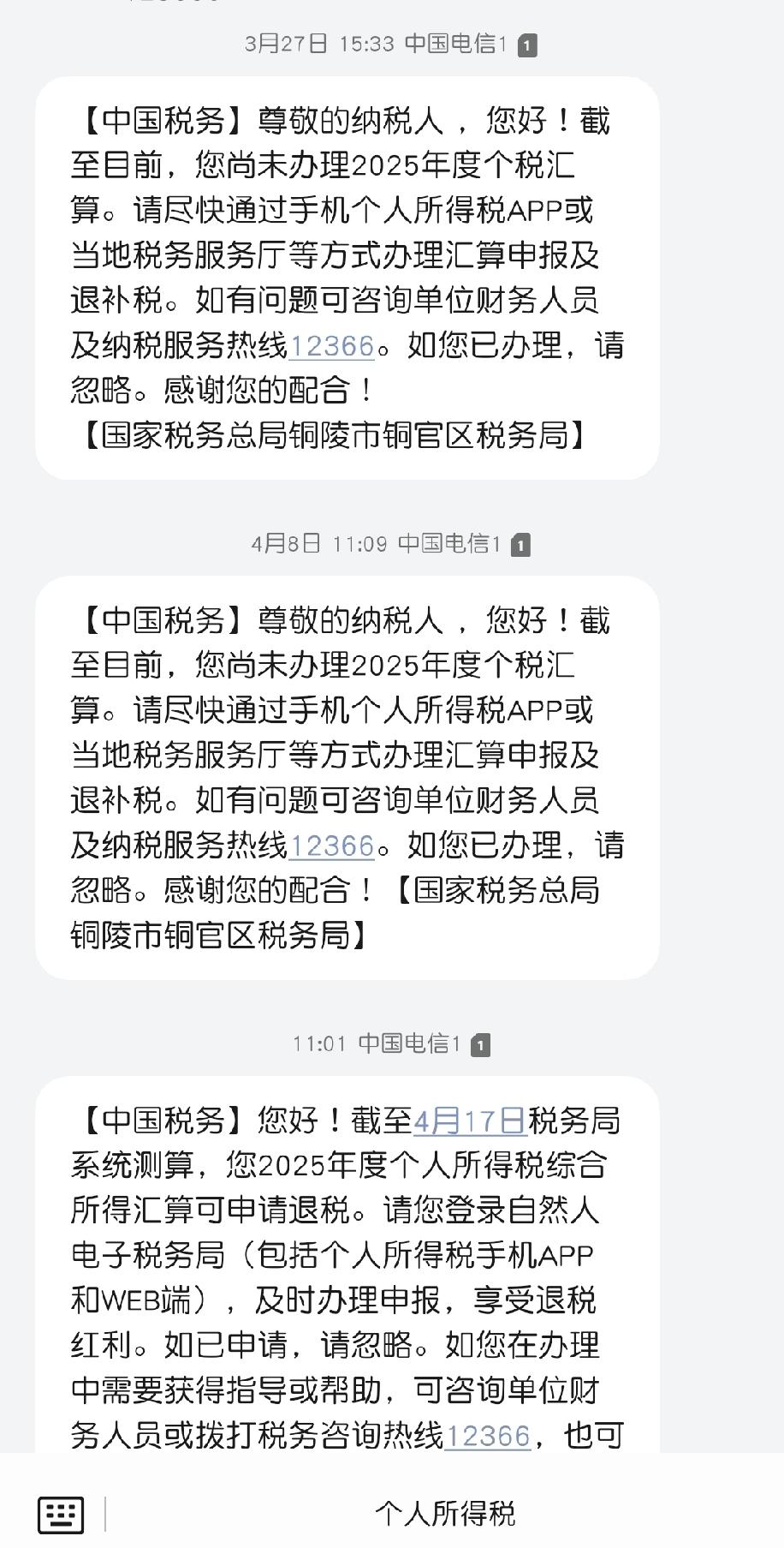 中国税务每隔一段时间就催我,要我赶快去申报退税,每次我都因为忙没理会,事后结果又忘了。今天又给我发短信催我,我这下才申报了退税。 虽然退的钱不多,但也想让我万分感慨,在许多人想尽办法掏空我的钱包时,唯有中国税务主动给我退钱。 这是一种什么精神,这是一种毫不利己专门利人的精神。原本这些钱给国家做贡献我也没异议。但中国税务让我体会到了各人的财富神圣不可侵犯啊。