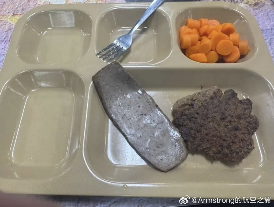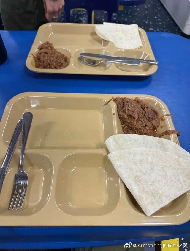 美伊以冲突 的黎波里号两栖攻击舰上的士兵伙食:一小勺肉丝和一张玉米饼。图2是林肯号航母的伙食,不知道是啥。