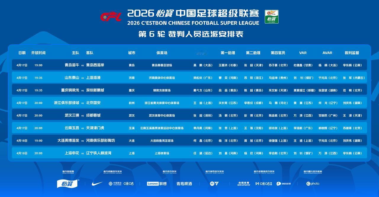 中超联赛第6轮裁判名单出炉,受罚裁判复出。 重庆铜梁龙主场对深圳新鹏,主裁判戴弋戈,VAR是麦麦提江。 可惜唐顺齐没有出山与麦麦提江共同执法,赛场上少了一道亮丽的风景线。 之前认定有错漏判的熊星、穆雨辰、甄伟继续消失在名单里。 两支遇到争议判罚的球队,浙江对北京国安,主裁判是王迪。 本场比赛会不会再出争议判罚?成为一大看点。