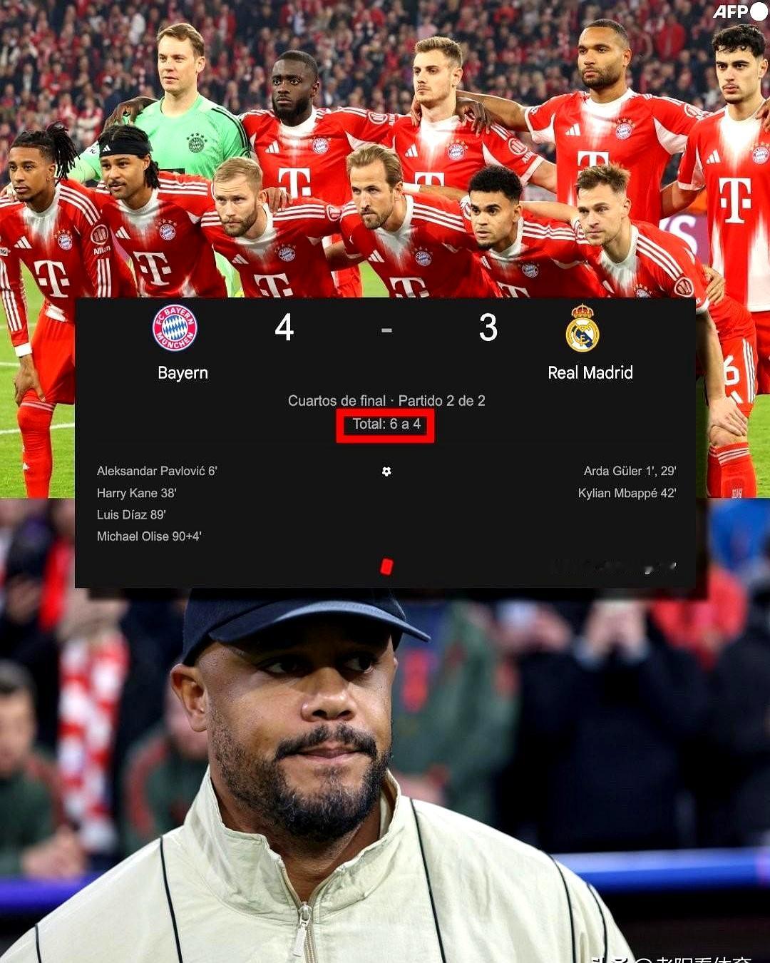 拜仁把皇马踢出局了!安联球场这夜简直疯了。 两边全场狂轰7个球。凯恩一直在拼命顶住压力,可诺伊尔出现了失误。就在大家以为要打加时赛时,皇马的卡马文加在86分钟两黄变一红被罚下,场上平衡瞬间塌了。 拜仁死命抓住机会,迪亚斯在89分钟破门锁定胜局,补时阶段奥利塞再入一球。总比分6比4,孔帕尼带队闯进四强,皇马欧冠之旅就此结束。 这支拜仁韧劲儿真足。接下来的半决赛要打巴黎圣日耳曼,你们觉得谁能赢?