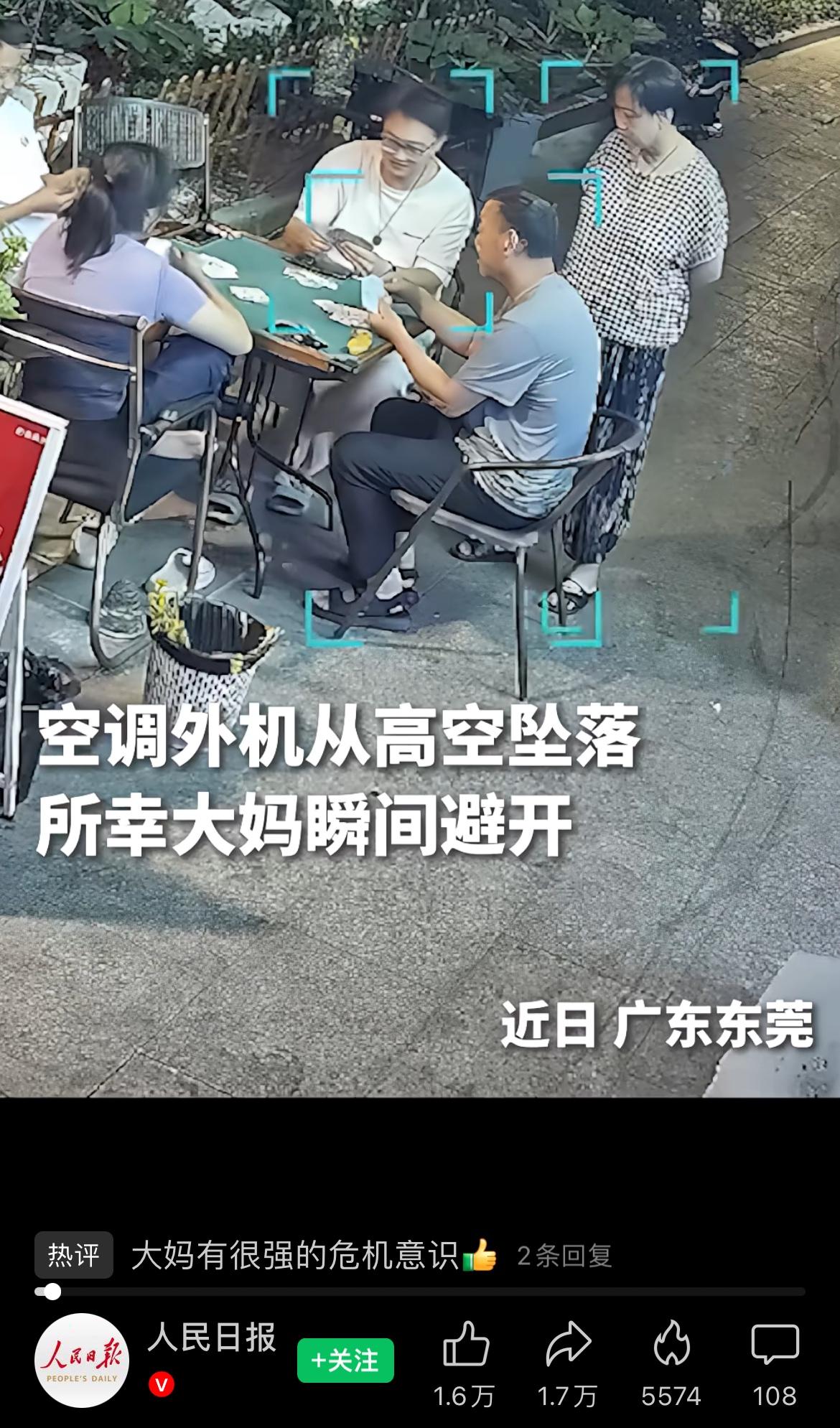 大妈的反应真的太迅速了,空调外机突然掉落,大妈听到声音之后甚至都没有抬头,就立马躲开,没想到空调外机直接砸到了她所站的位置,空调外机砸到地板上砸烂了,这要是抬头一看再躲开的话肯定来不及了,大妈的危机意识太强了