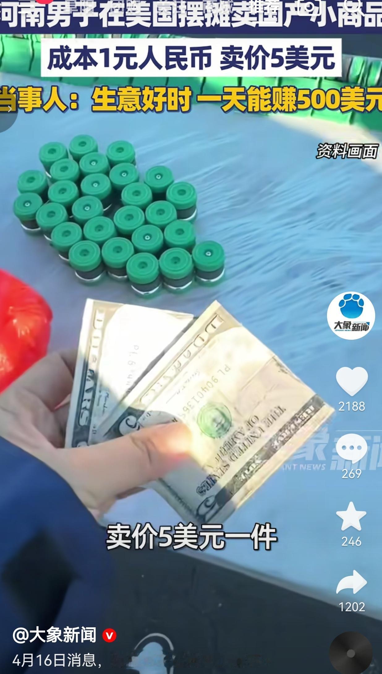 河南大哥在美国摆摊,把1块钱的国产小商品卖成了“香饽饽”! 33岁的河南大哥陈先生,在美国洛杉矶的集市上,摆起了咱们中国产的小商品摊。 摊上卖的都是些不起眼的小玩意儿:磨刀器、老花镜,还有各种实用小工具,成本大多才1块钱人民币,到了他的摊上,统一卖5美元一件。 一开始,他也没抱太大希望,可没想到这些便宜又好用的“中国制造”,一摆出来就火了。 路过的美国人,不管是大叔大妈还是年轻人,都忍不住停下来看,现场演示一下磨刀器,当场就能成交。 尤其是周末集市人多的时候,他的摊前总是围着一圈人,忙得连喝口水的功夫都没有。 大哥自己都说,生意好的时候,一天能赚500美元,平时也能稳定在300美元左右,月入差不多1万美元。 他卖的不是什么高大上的品牌,就是咱们国内几块钱就能买到的东西,靠的就是性价比和实用性,把“中国制造”的口碑直接打出去了。 网友看到后评论说: “这才是真正的‘把小商品做成大生意’!大哥太会了!” 也有的网友说: “咱们的国货在国外这么吃香?果然,实用才是硬道理!” 还有的网友说: “成本1块卖5美元,这利润,我都想去摆摊了!” 更有网友表示: “河南大哥太给咱长脸了,把咱们的小玩意儿卖到国外去了!” 说真的,看完这事儿,我心里特别感慨。以前总觉得“国货”在国外没市场,可陈大哥用事实告诉我们,只要东西好、够实在,在哪都能吃香。 他没靠什么高科技,也没搞什么花里胡哨的营销,就是凭着咱们中国人的务实和肯吃苦,把不起眼的小商品做成了自己的生意。 这不仅是他个人的成功,也是咱们“中国制造”实力的证明。那些被我们习以为常的小物件,藏着的是中国供应链的强大,也是普通人靠双手改变生活的底气。 最后,我想说的是:平凡的双手,也能把中国制造,卖到全世界。 对此,你怎么看?