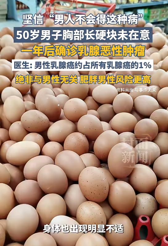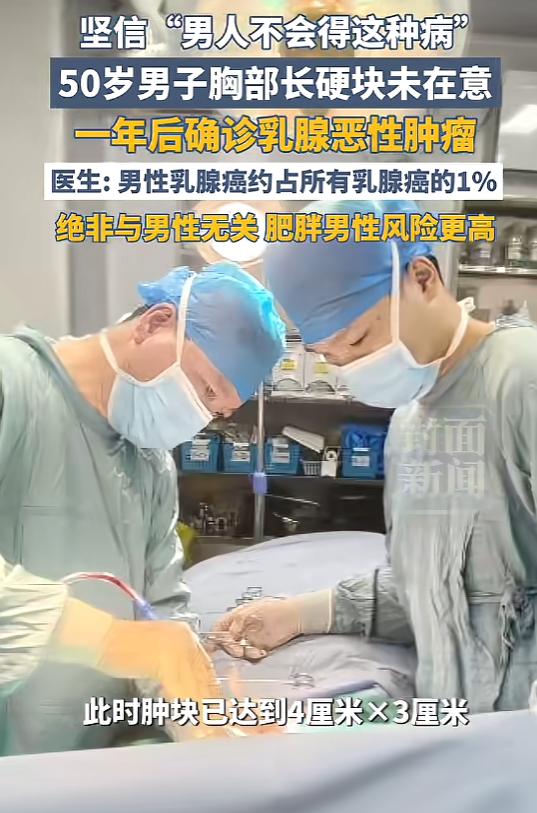 “悲剧还是发生了!”广西南宁,一男子洗澡时,发现胸部下方有个硬块,因为不痛不痒,所以没当回事,没想到硬块慢慢变大,直到最近身体不适,男子才去医院,最终被确诊为乳腺恶性肿瘤,因为病情被延误,治疗难度也增加了!网友:男性也会得乳腺癌? 广西南宁的一位大哥,或许怎么都未曾料到,洗澡时指尖不经意触碰到的那个硬疙瘩,竟会在日后将自己送进肿瘤科。 花生米那么大,硬邦邦的,边缘摸不太清楚。关键之处在于,其状态不痛不痒,即便按压几下,亦毫无反应,仿若陷入一种沉寂而麻木的状态,令人有些无奈。他当时就琢磨:八成是最近干活累着了,上火长个结节,或者不小心磕碰了一下,过两天自己就消了。 这一"过两天",就是一个多月。 洗澡之际,他下意识地又摸了摸,刹那间,心中猛地一紧——那物件竟悄然长出了一圈。但他还是没当回事,心想就算长大了也是良性的,能有多大事? 此种心态,于诸多男性身上皆可觅得踪迹。它似隐匿于日常的细微之处,悄然彰显着一种共性,在不经意间便让人察觉到其存在。对于那些轻微的病痛,只要尚未对劳作与挣钱造成影响,人们往往会选择默默忍受,以坚韧之态硬扛过去,继续为生活奔波。去医院检查个小包块?那不是小题大做吗?男人嘛,就该顶天立地。 身体并非能以道理相劝之物。它自有其运行的规律与法则,不会因主观的意愿和道理而改变,一旦被忽视,便会以自己的方式发出警示。那个悄然无息、几无痛感的小疙瘩,宛如隐匿的恶魔,正以悄无声息却又势不可挡之势,逐渐蚕食着他的健康,威胁着他的生命防线。 直至近日,他的身体实在不堪重负,再也难以支撑,这才惊惶失措地朝着医院奔去。所有检查单子砸在面前的那一刻,他整个人都懵了:乳腺恶性肿瘤。 消息一经传出,评论区即刻沸腾,恰似油锅乍爆。各类观点与言论如浪涛般汹涌而至,一时间,整个评论区热闹喧嚣,好不壮观。最多的留言就是:"男人也会得乳腺癌?" 很多人打心眼里觉得,乳腺癌是女人的专属病,男人压根不沾边。就是这种死板的错误认知,让大批老爷们儿完全忽视了胸部发出的救命信号。 其实男人的乳腺组织虽然没女人那么多,但底子还在,依然有病变的可能。医学面前从来不分性别,只有生与死的博弈。 更要命的是,那些不疼不痒的身体肿块,往往才是最致命、最容易被忽视的健康陷阱。疼痛从来不是疾病严重程度的标尺。它安静、无害、不打扰生活——这恰恰是恶性肿瘤的狡猾之处。 这位大哥平时烟抽得不多,偶尔喝点小酒,身材匀称,看着挺结实。按理说不该摊上这事。可性格大大咧咧,有点糙,觉得"男人就该扛着",这种心态反而成了催命符。 从花生米大小到恶性肿瘤,中间隔着整整一年的延误。错过了最佳治疗时间窗口,治愈难度成倍增加。每一个"早一天",都是活下去的筹码。 有网友看完新闻吓出一身冷汗:"我胸口好像也有个小包,明天就得去排号检查。"这条新闻至少让一部分人开始正视身体发出的信号。 别等身体"扛不住了"才就医,别等"不痛"变成"痛不欲生"才后悔。 身体给你发信号,不是让你猜,是让你回应。 (信息来源:《广西50岁男子确诊乳腺癌:因认为“男人不会得乳腺癌”,胸部长硬块拖延一年才就医。》封面新闻)