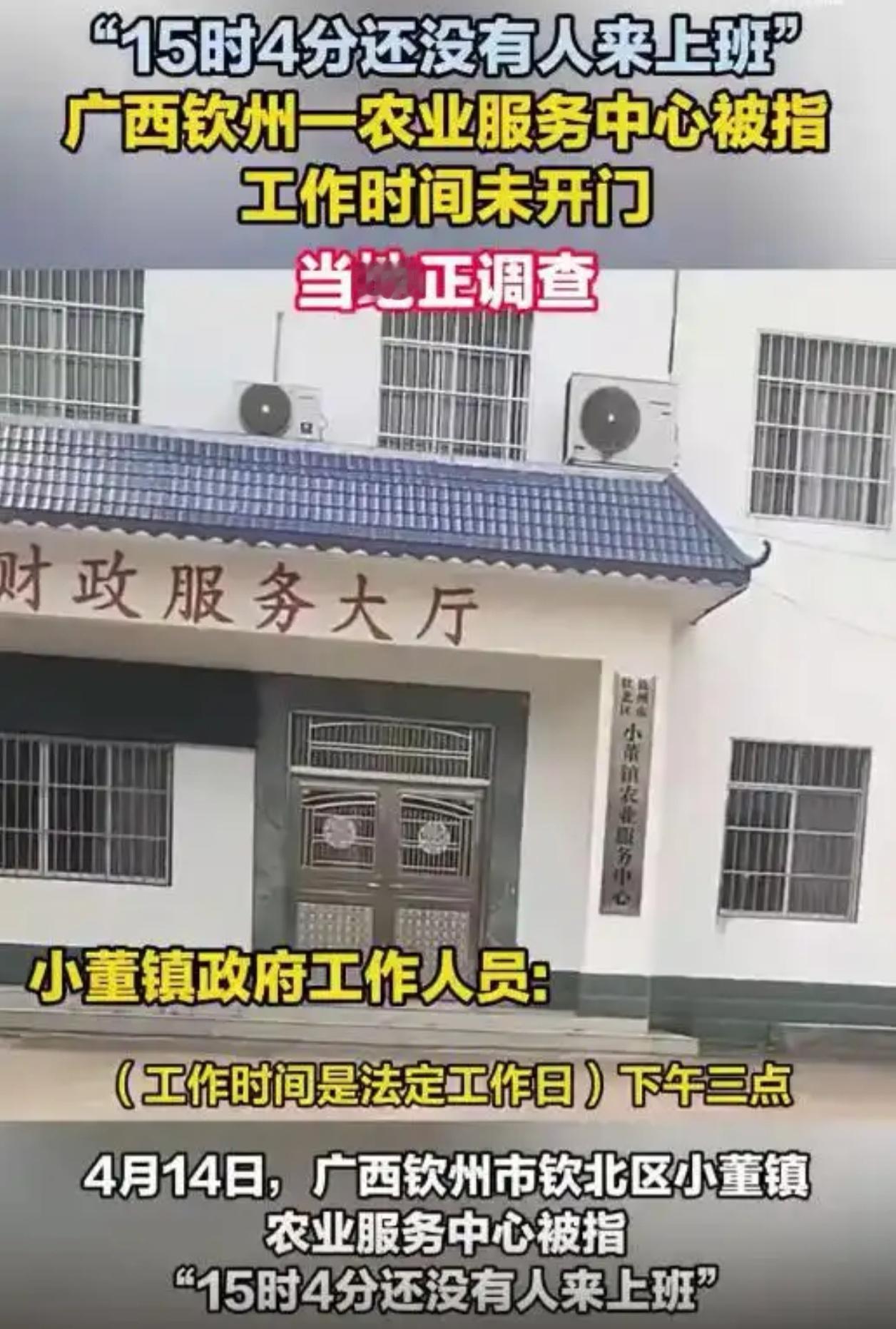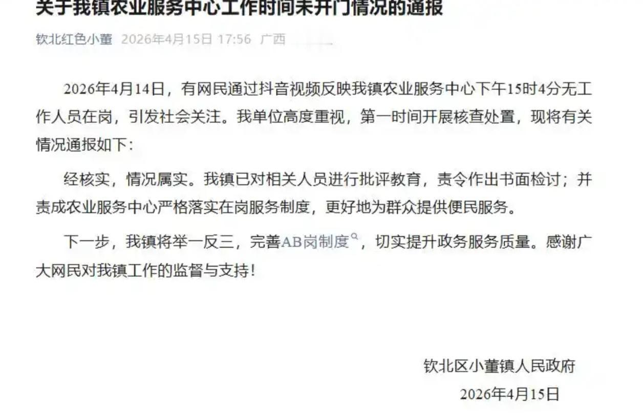 下午3点的“铁将军”:小董镇农业服务中心空岗事件全记录 4月14日15时04分,广西钦州市钦北区小董镇农业服务中心的大门紧锁,空无一人。这幕场景被办事群众拍下传到抖音,迅速引发热议。次日,小董镇政府通报确认情况属实,对相关人员进行批评教育并责令书面检讨,同时提出将完善AB岗制度以提升服务质量。 一、 窗口虽小,连着民心 这不仅仅是一次简单的脱岗。农业服务中心承担着农技推广、惠农补贴申领、动物疫病防控等关键职能,是乡镇最前沿的“民生关口”。 事发时正值下午上班时间,群众满怀期待而来,面对的却是“铁将军把门”。这种落差直接损耗了基层政府的公信力。正如媒体评论所言,基层站所是政府联系群众的“最后一公里”,窗口虽小,却直接连着民心。 二、 “机构合并”不是空岗理由 事件曝光后,曾有工作人员解释称因“机构合并,人员分散在各处办公”。这一说法难以服众。机构合并旨在优化职能,而非让服务“断档”;工作安排再灵活,也不能让窗口在法定工作时间唱空城计。 从现有信息看,小董镇农业服务中心核定人员不少,完全具备在岗履职的条件。此次空岗,更多暴露出的是纪律松弛与宗旨意识的缺位。 三、 治标更需治本 “批评教育+书面检讨”是标准的应急处置,但公众更关心的是如何根治顽疾。通报中提到的“完善AB岗制度”切中要害——A岗不在时B岗必须补位,外出需交接,离岗需报备。如果制度此前就已健全,何至于此? 要杜绝“上班时间找不到人”的现象,不能仅停留在纸面问责。唯有让“心”在岗,让制度真正长出牙齿,从“被动补位”转向“主动服务”,才能确保基层服务的窗口不空、人心不冷。 四、 最新进展:已返岗履职 截至4月17日,该事件有了最新后续。官方对此事的处理方式是批评教育与责令检讨,并未涉及停职或开除。因此,在完成相关处理后,涉事人员已经回到工作岗位正常履职。同时,镇政府也已责成该中心严格落实在岗服务制度,并计划完善AB岗制度,以防止类似空岗情况再次发生。 💬 互动话题: 你认为对于基层窗口单位的脱岗行为,“批评教育+书面检讨”的处罚力度够吗?完善AB岗制度能有效避免这种情况吗?欢迎在评论区留下你的看法!