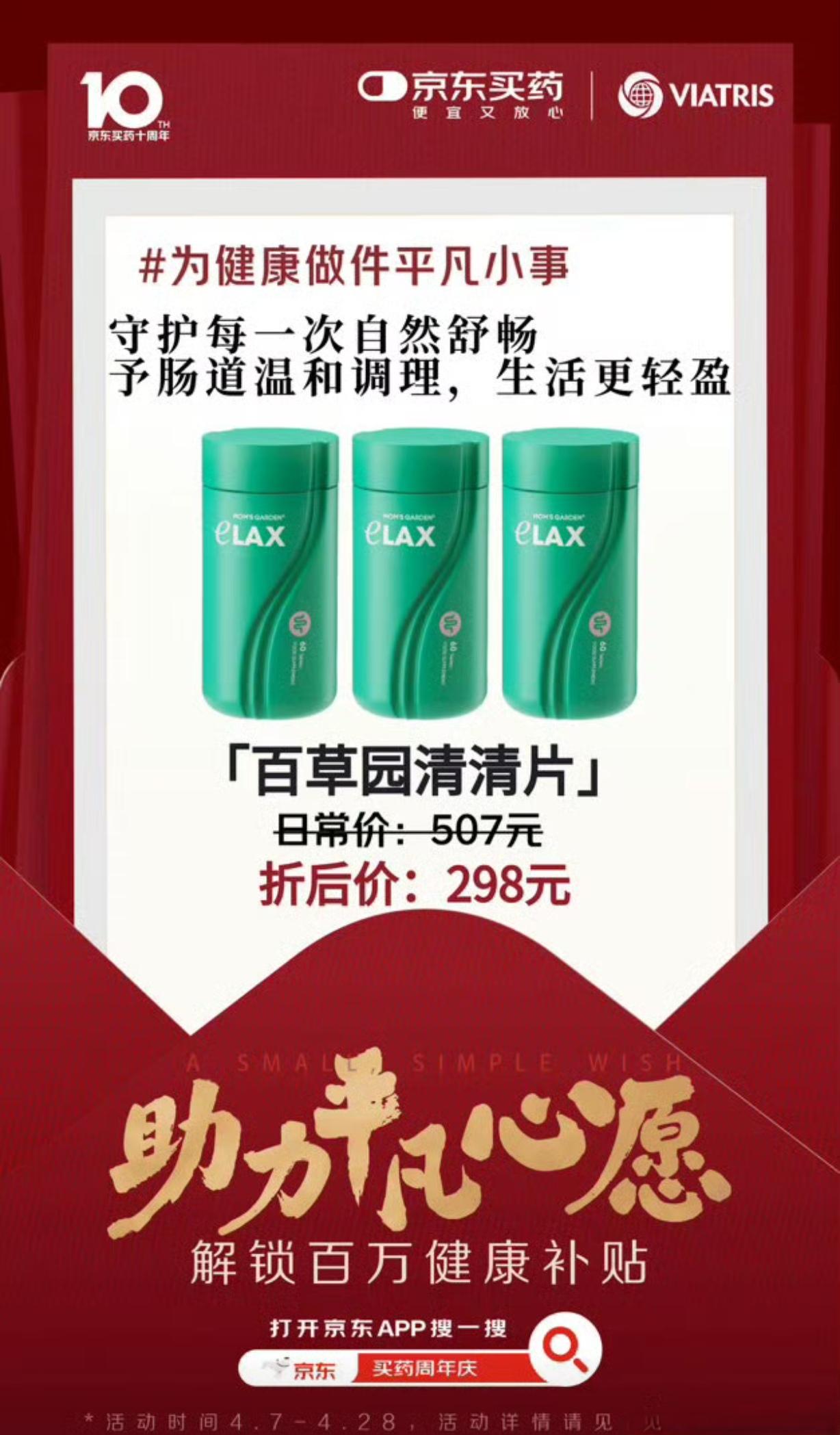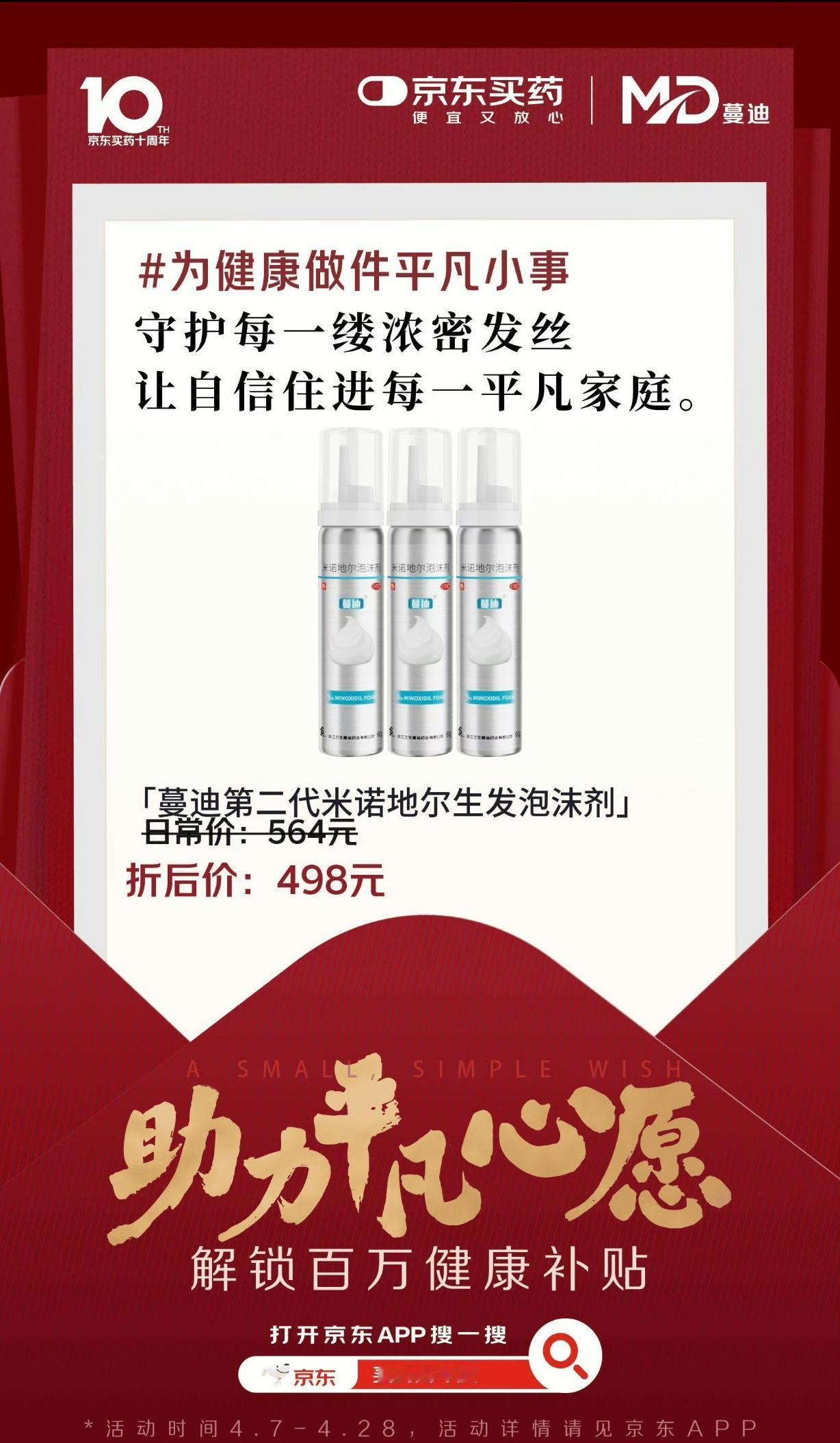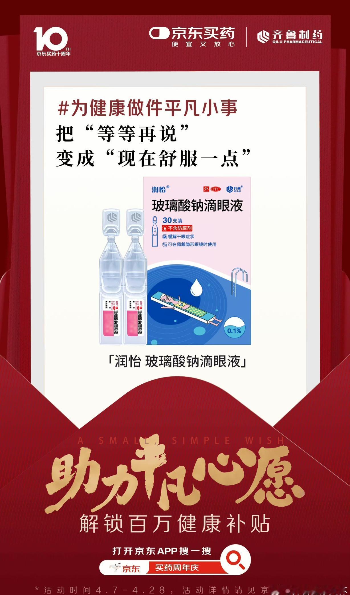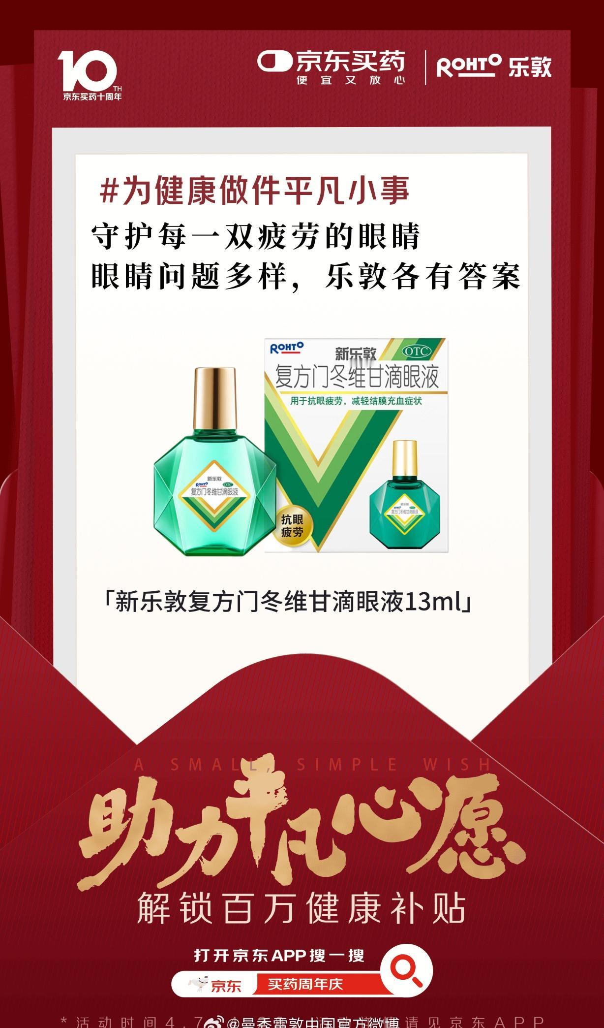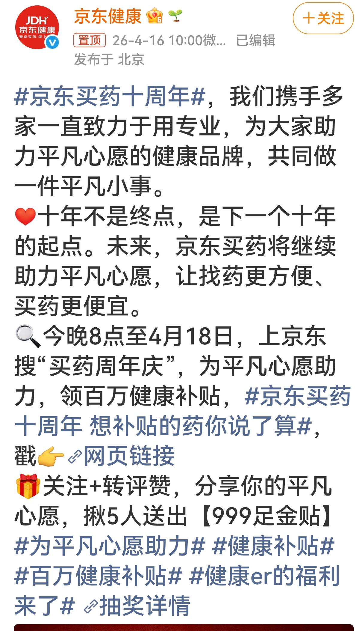 京东买药十周年,百万健康补贴暖心来袭✨ 京东买药迎来十周年啦!携手各大专业健康品牌,一起做一件守护大家健康的平凡小事,用专业助力每一个平凡的健康心愿。 十年相伴,初心不改,这不是终点,而是全新的起点!未来京东买药会一直坚守,让大家找药更便捷、买药更实惠,把安心健康送到每个人身边。 福利重磅来袭!今晚8点至4月18日,上京东搜索“买药周年庆”,就能领取百万健康补贴,而且想补贴的药,全都由你说了算! 现在关注+转评赞这条动态,分享你的平凡健康心愿,还能抽5位朋友送出【999足金贴】好礼! 用心守护健康,用福利回馈大家,赶紧上京东参与活动,为自己和家人的健康添一份保障~ 京东买药十周年 为平凡心愿助力 百万健康补贴 健康补贴