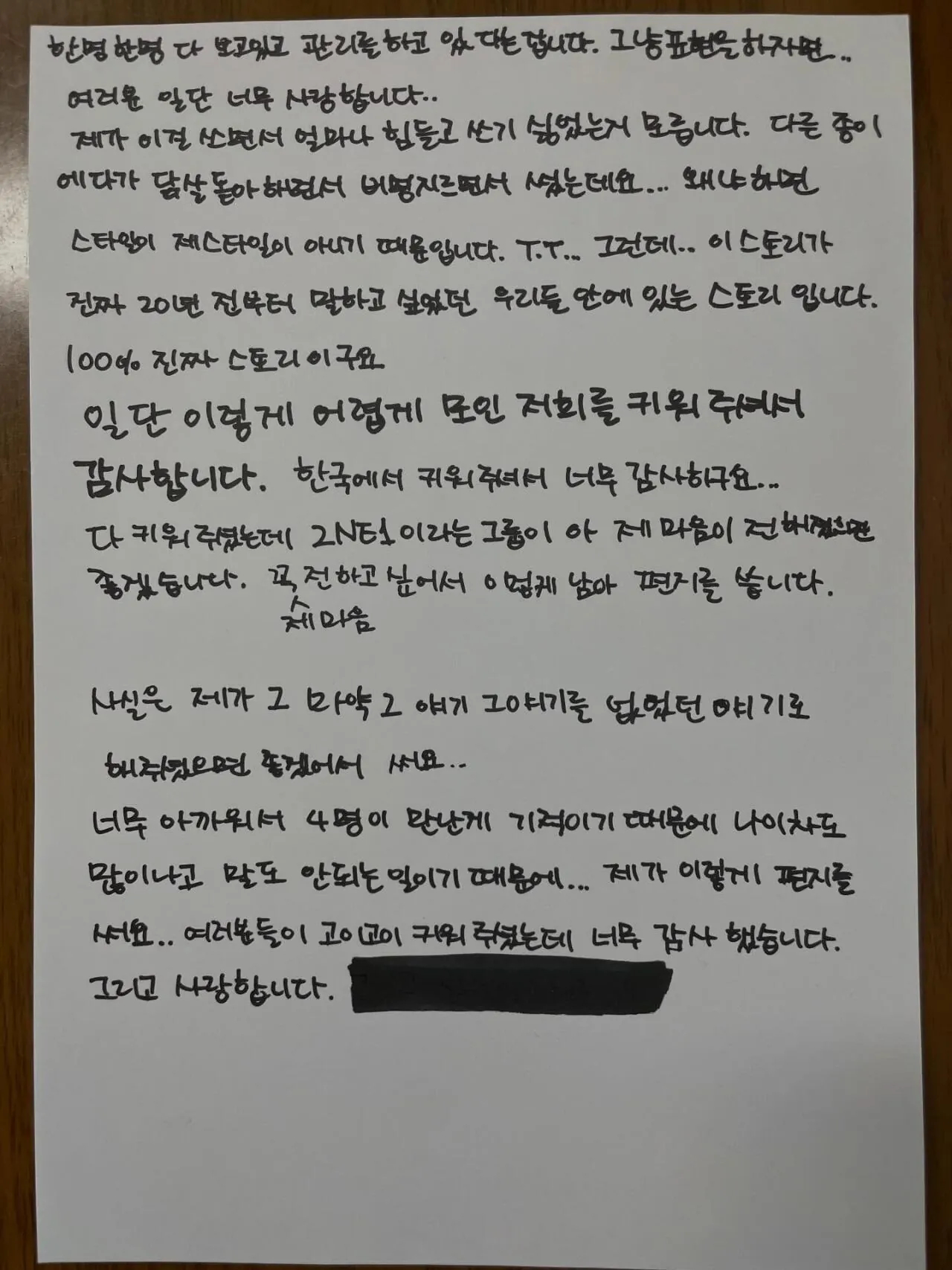 朴春对三位成员表达了“非常爱她们”。朴春说:“感谢你们将好不容易聚在一起的我们,在韩国培养成2NE1这个组合”,并希望自己的心意能够传达出去。