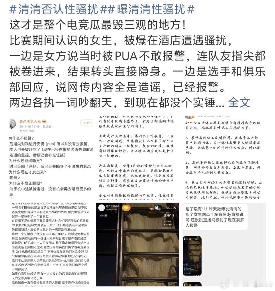 曝清清性骚扰两边都各执一词给我看不会了老半天了能不能出点实锤?电竞圈最近也是多事