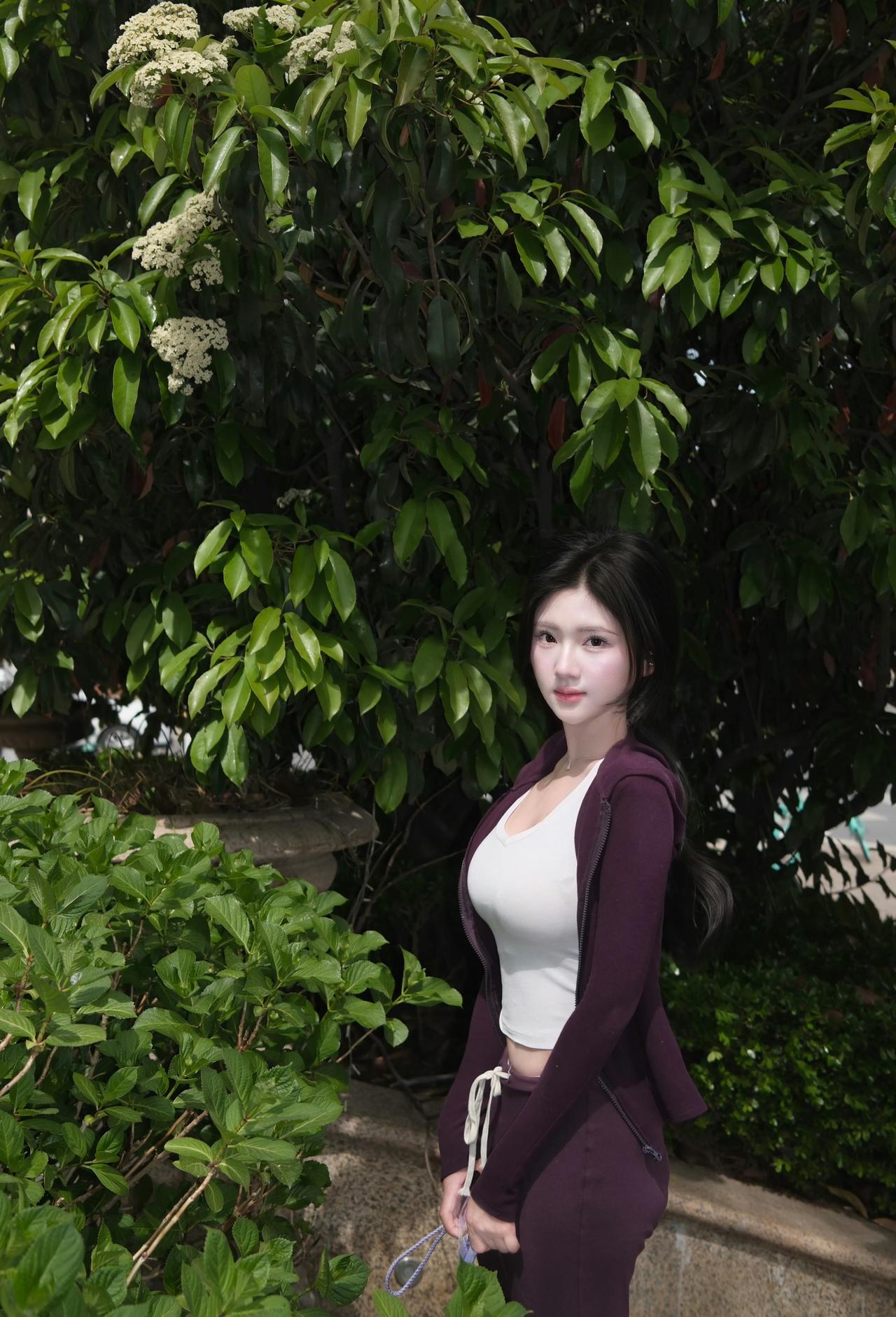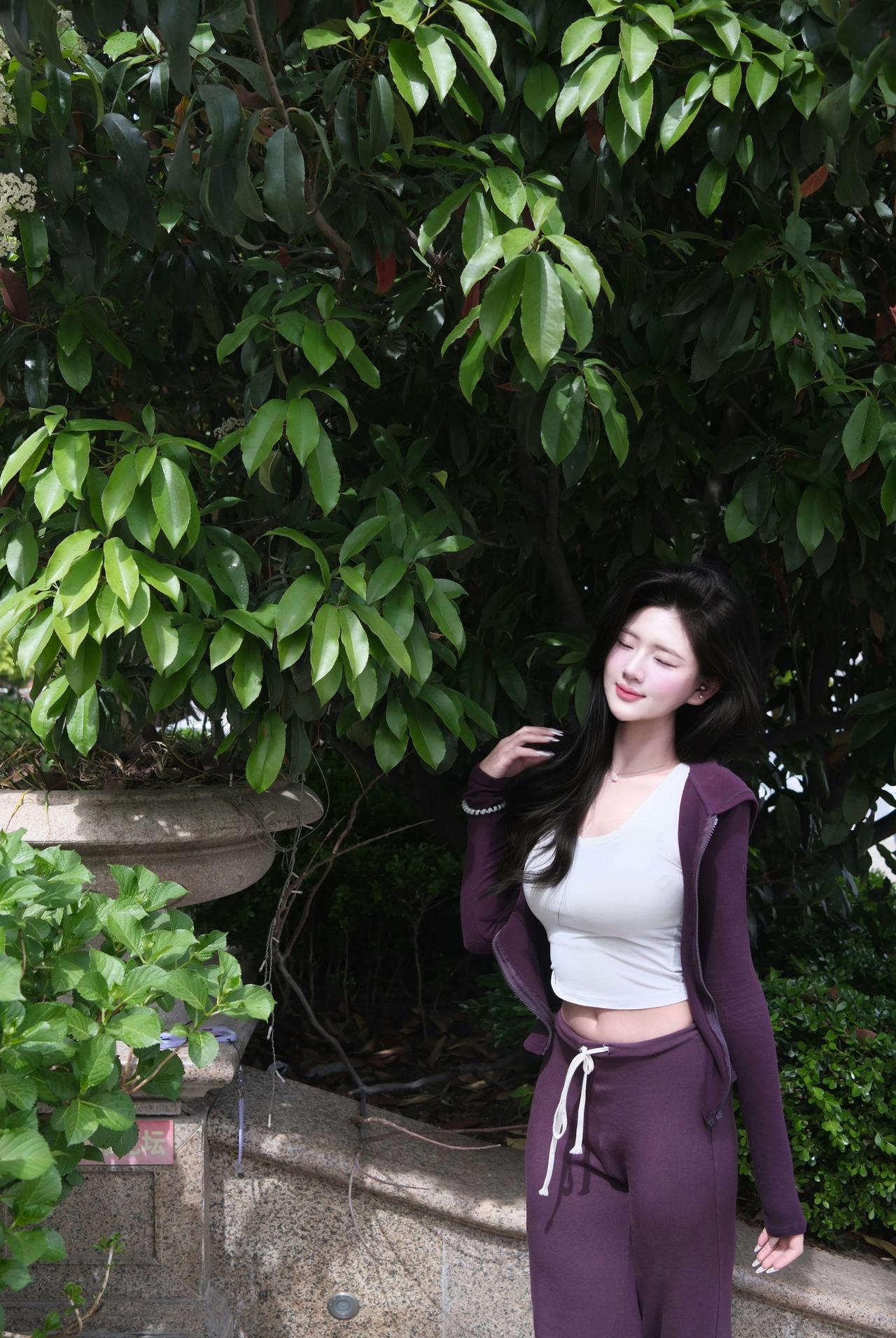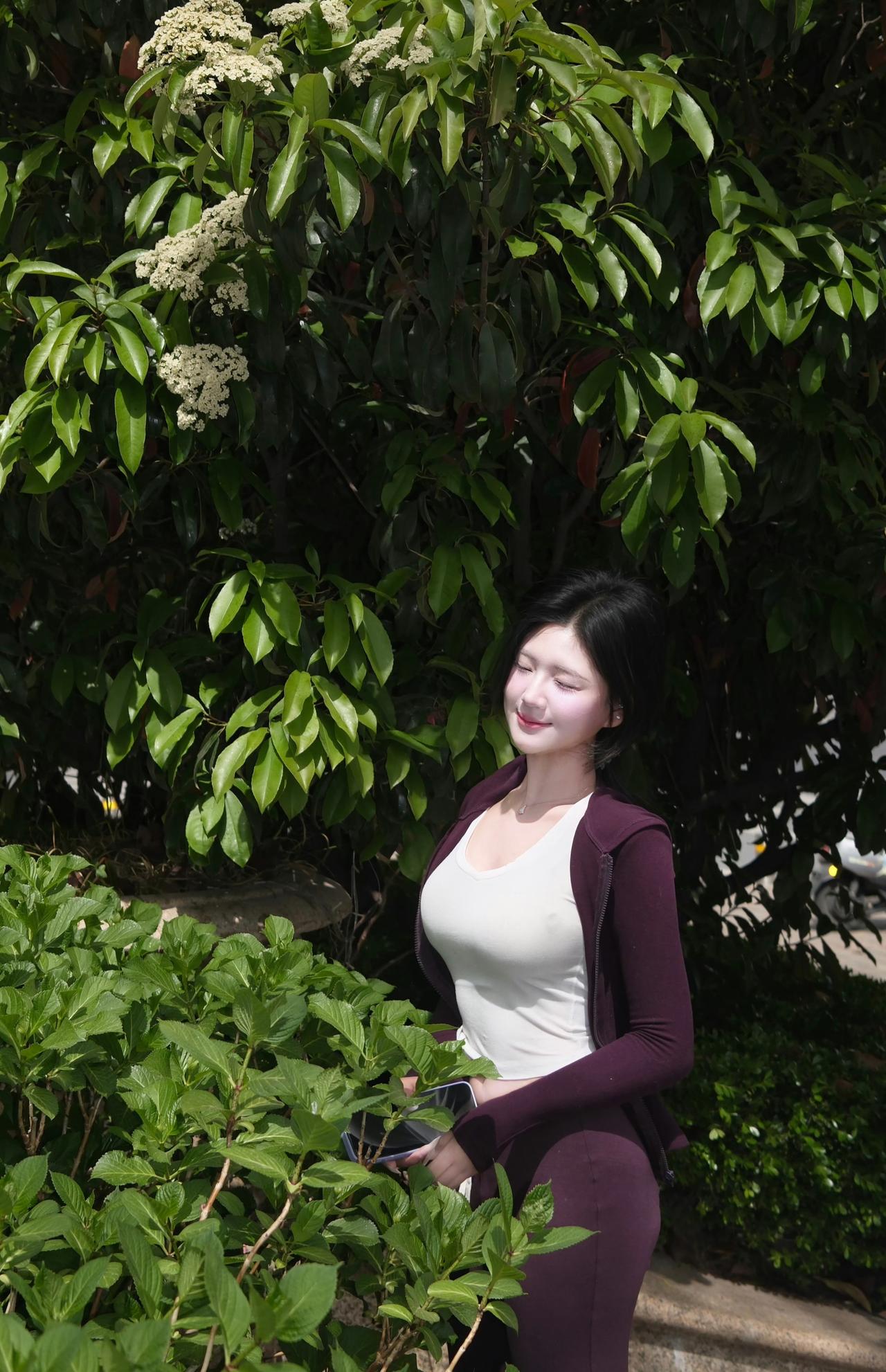 在绿意盎然的公园里,甜美少女轻轻托腮,宛如童话中的公主。🌿💕