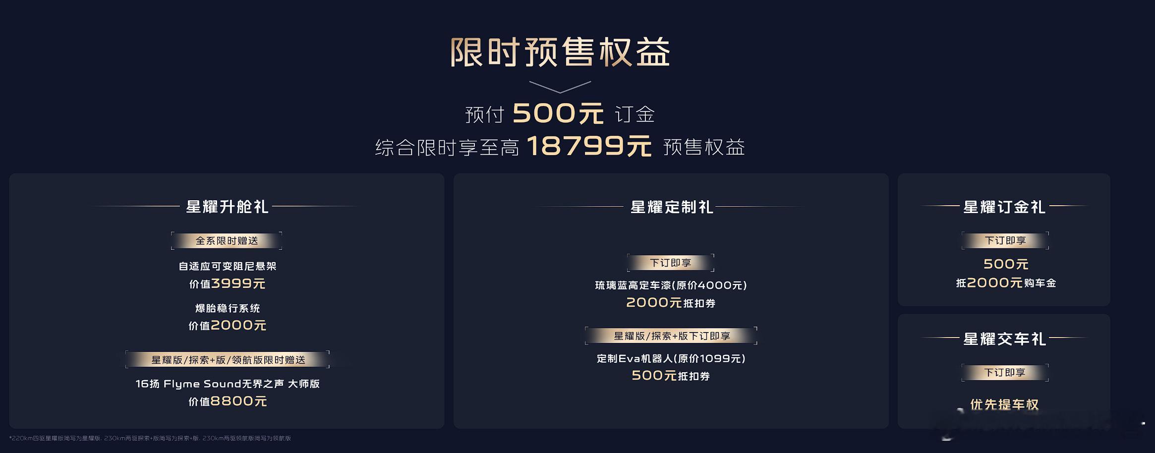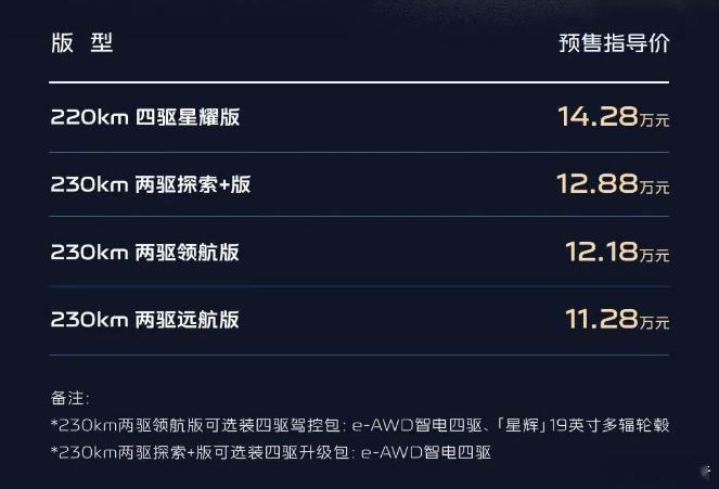 4月16日,吉利银河星耀7正式预售,新车共推出4款配置车型,预售区间为11.28-14.28万元。