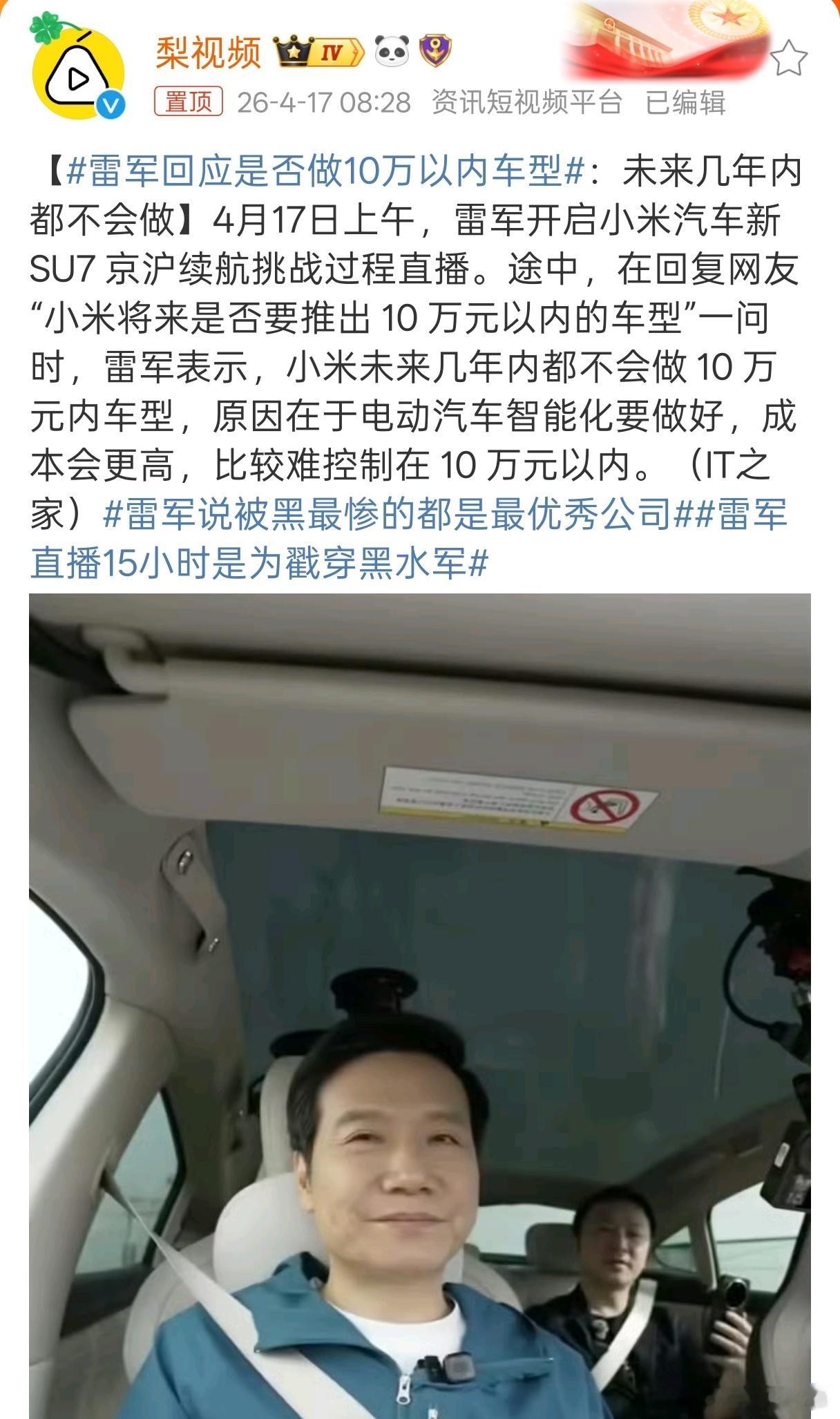 雷军回应是否做10万以内车型 看目前SU7和YU7的销量,小米肯定不会往10万元以内的市场去碰。