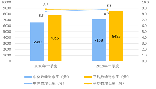 2019年一季度人均可支配收入8493元,中位数7158元。人均说不清,可能是一些人收入极高拉动的。中位数是说一半人比这个收入高,应该能较好代表平均水平。2026年一季度的中位数10433,比2019年的7158大增了46%。