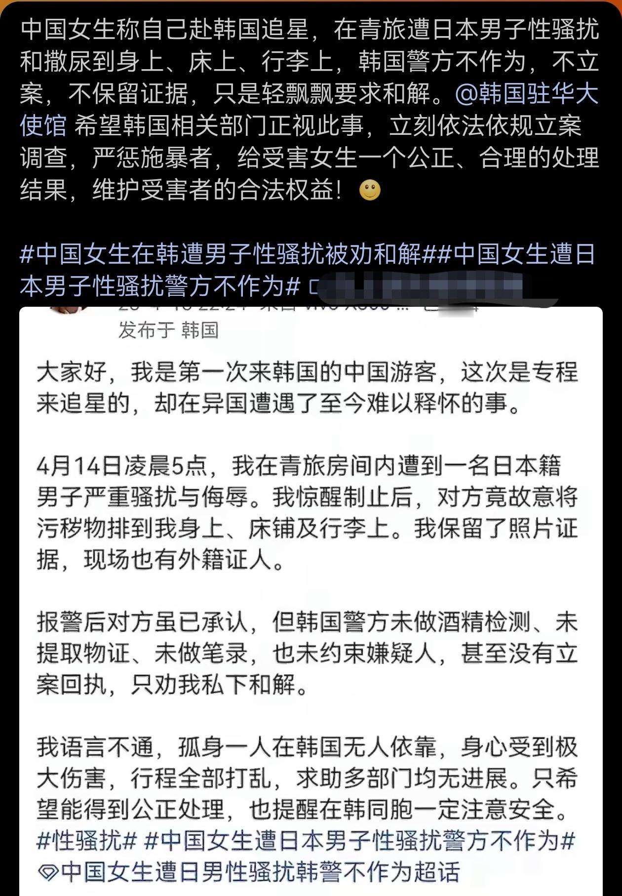 还有这等奇葩?中国女生称自己赴韩国追星,在青旅遭日本男子性骚扰和撒尿到身上、床上、行李上,韩国警方不作为,不立案,不保留证据,只是轻飘飘要求和解。