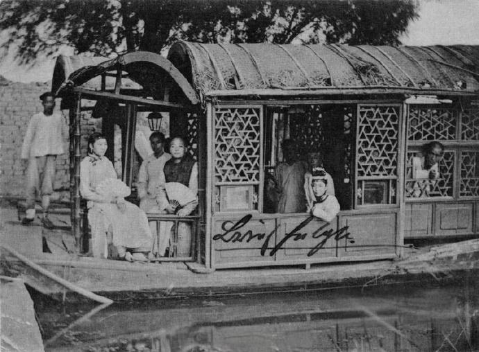 1906年3月,济南护城河畔,一艘内河画舫静静泊在水面上,船身由木竹搭建,棚顶覆盖着竹篾编织的篷顶,舱室开着菱格镂空花窗,兼具采光功能,这是济南大户人家专属的游河船型。 船舷边,几位身着袄裙的富家女子围坐,有人手持团扇,神态闲适;舱内也有女子探身向外,身旁立着穿短打的侍从仆役,完整还原了济南上层社会春日游河的场景。