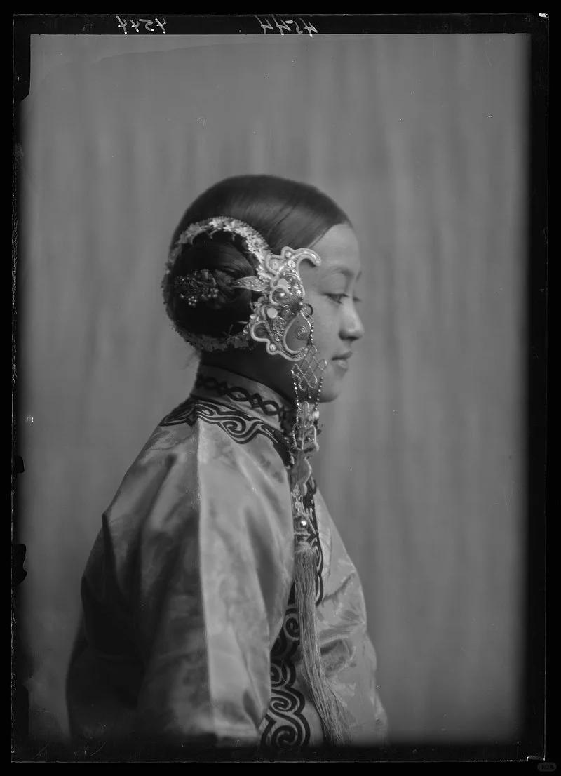 这张老照片,是晚清汉族仕女的经典侧影,照片中女子的发型,是清末汉族仕女风靡一时的“蚌珠头”。 这种头型是将头发梳理得极为服帖,盘成扁平的椭圆形发髻,紧贴颅侧,形似蚌壳或螺壳,因此得名。发髻边缘装饰着蕾丝或银质花钿,后部点缀珠花发饰,既修饰了脸型,也体现了仕女的精致妆造。