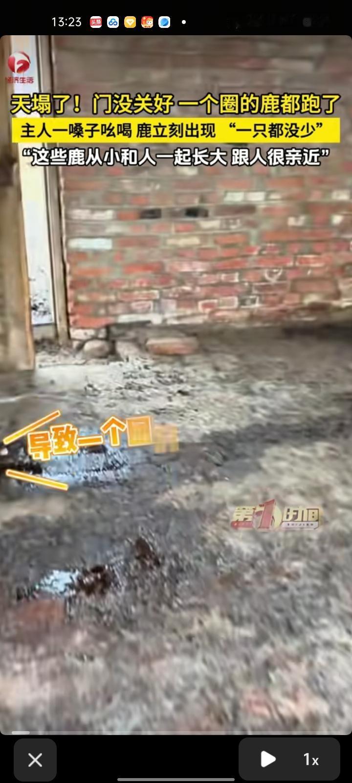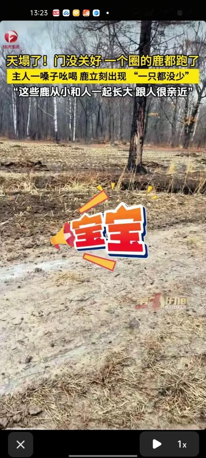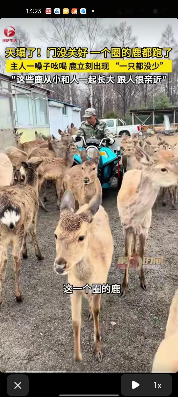 4月16日,延边州敦化市。女子发视频表示,昨晚鹿圈的门没关好,一个圈的路跑了,一个嗓子吆喝,鹿立刻出现,一个都不少。这些鹿是从小跟人一起长大的,非常亲人,很温顺。