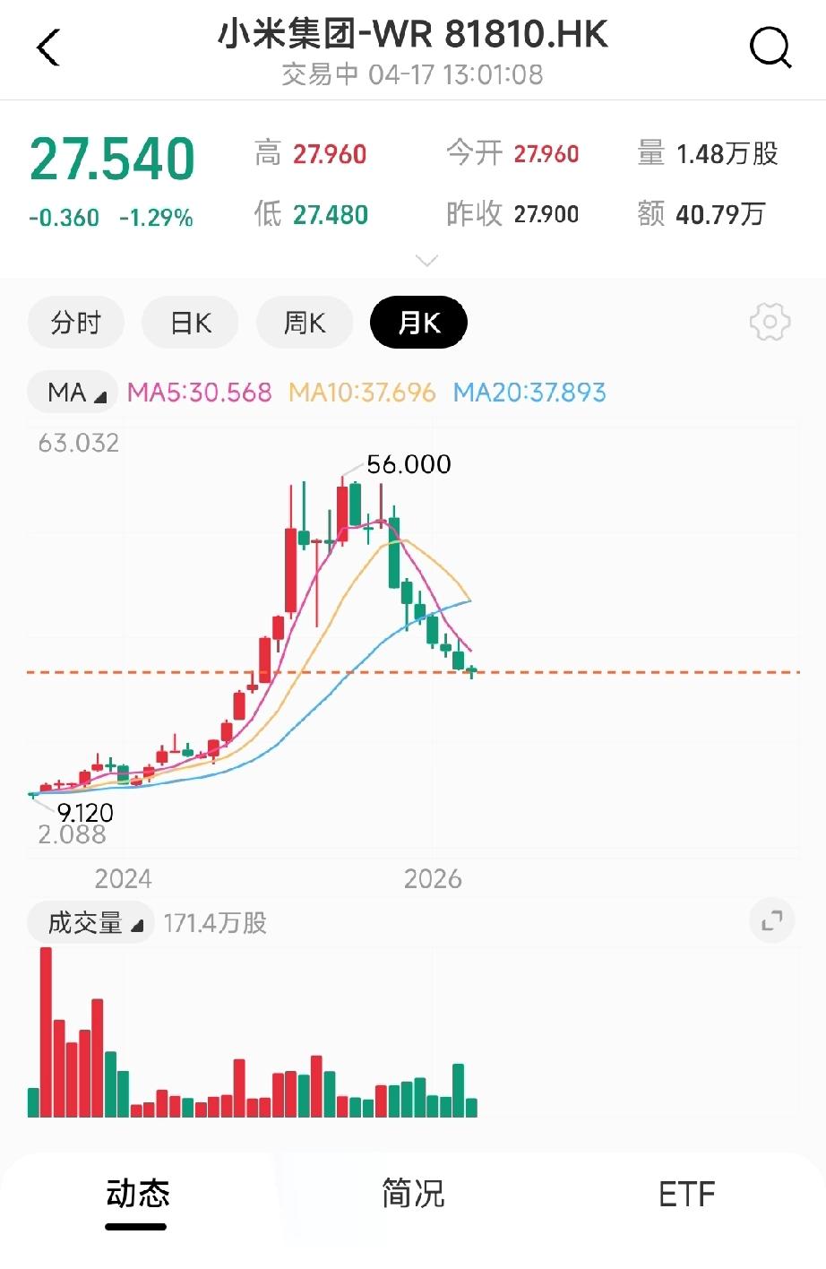 哎,小米股票又又又跌了。从最高的是56到现在27,这一路往下跌。雷总啊,咱这个小米手机销量这么好,小米汽车也是一路高歌猛,这个股票怎么这么不给力的呢?能不能出来说一说原因?这样搞下去的话,那支持你的米粉们,那就对你有意见了,可能就会动摇了。雷总啊,你想想办法,把这个股票往上提一提。