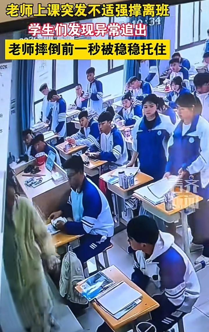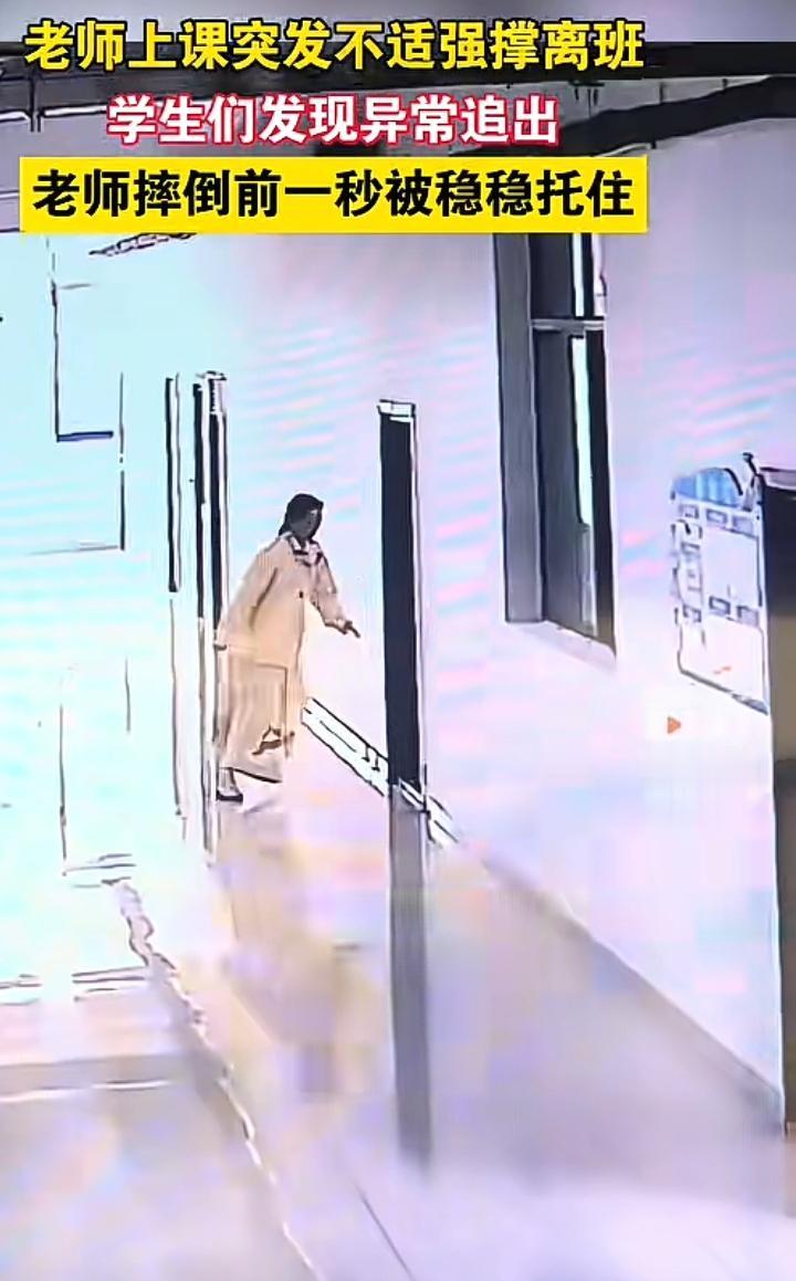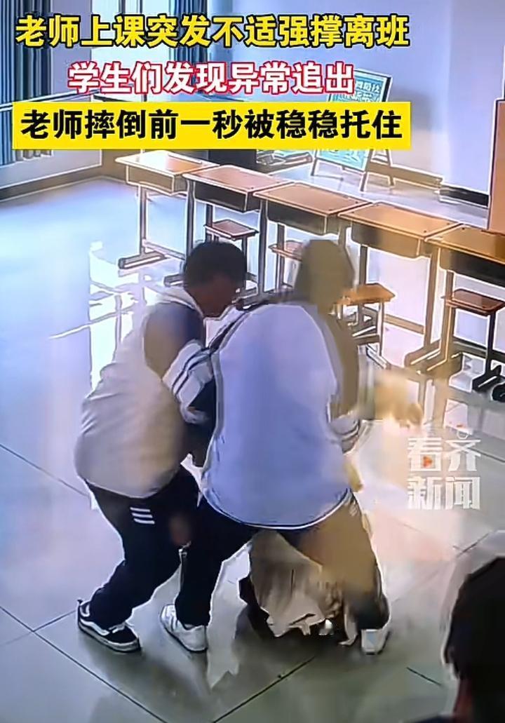 近日贵州六盘水某中学一名女教师在上课期间忽然感到耳鸣目眩,身体摇摇晃晃,可她凭着毅力用手扶着讲台前的课桌,颤颤巍巍的走向自己的办公室,这一切学生看在眼里急在心里,一名男同学目送着老师艰难的离去,此时的他除了迷茫或许也不知道该怎么办。 女教师身材纤细穿着长裙可她的肢体动作已经不受控制,或许是感冒引发的也许是低血糖,就在女教师将要倒地的那一刻,两名男同学迅速的托起了她虚弱的身体,一名女同学搬来了一个小凳子,此时此刻或许能明白亦师亦友的温情。