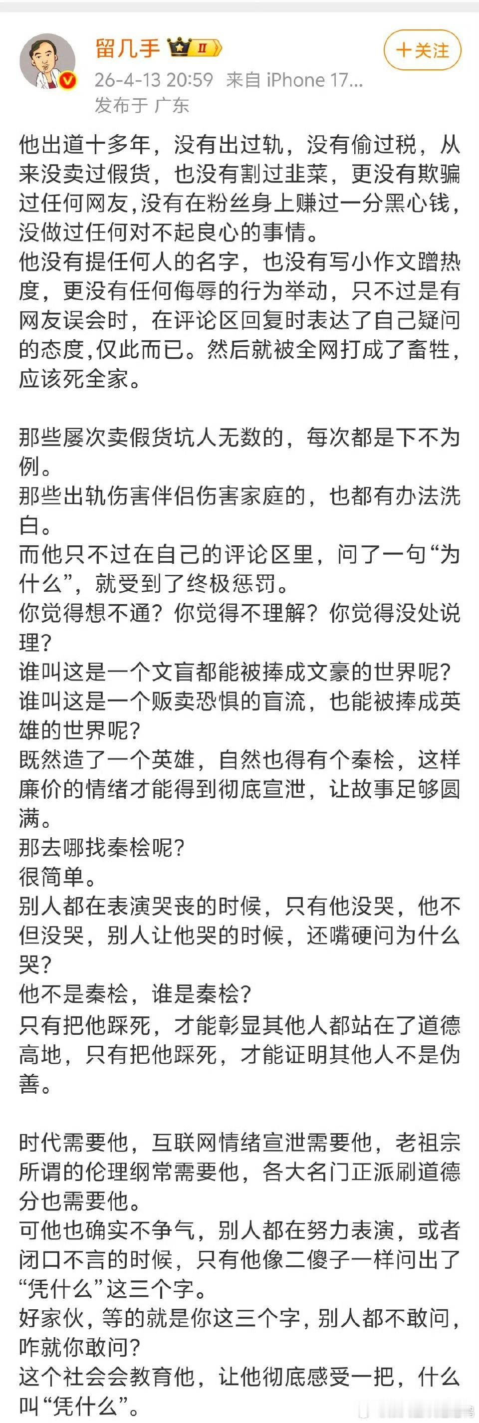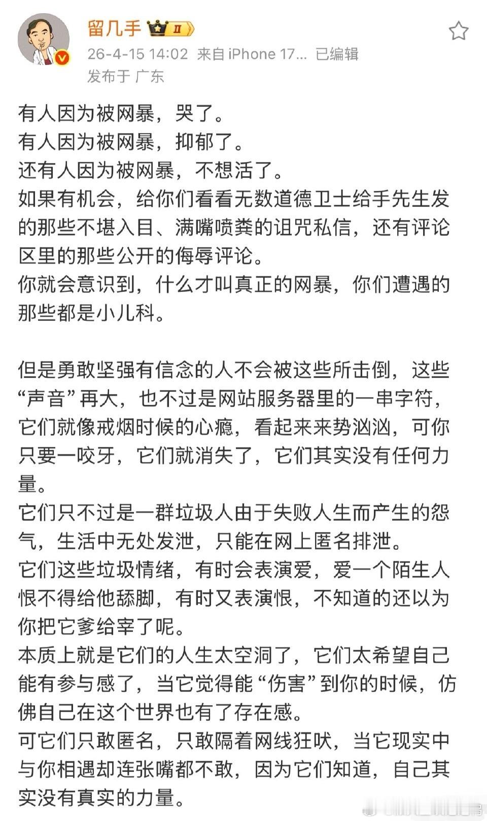留几手因不当言论被平台封了一个月后,终于被“放”出来了!这一刚放出来,他就憋不住,几大篇长篇大论就出来,他不仅没有反思、道歉,而且还觉得自己很委屈、很冤枉,说他自己也遭受到了网暴,话说,你被网暴不是活该么?谁叫你嘴巴那么臭?