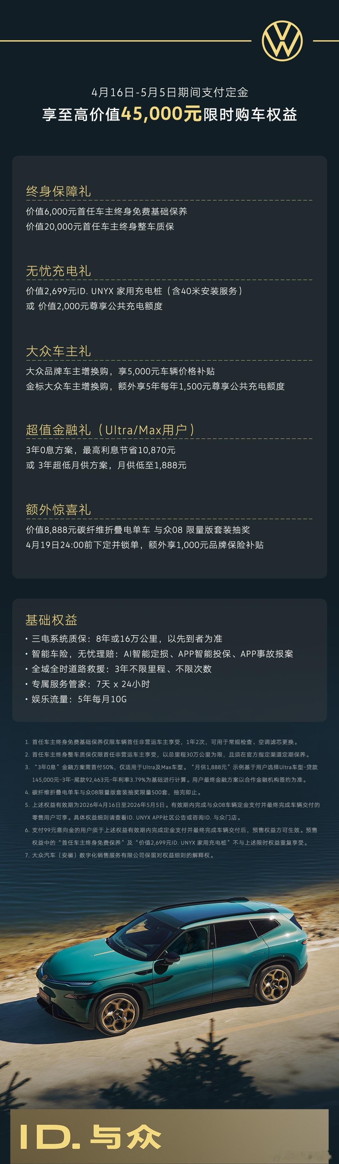 4月16日,大众汽车安徽旗下中大型纯电SUV与众08上市,售价区间22.99-28.99万元,5月5日前下定用户还可享受至高4.5万元购车权益。