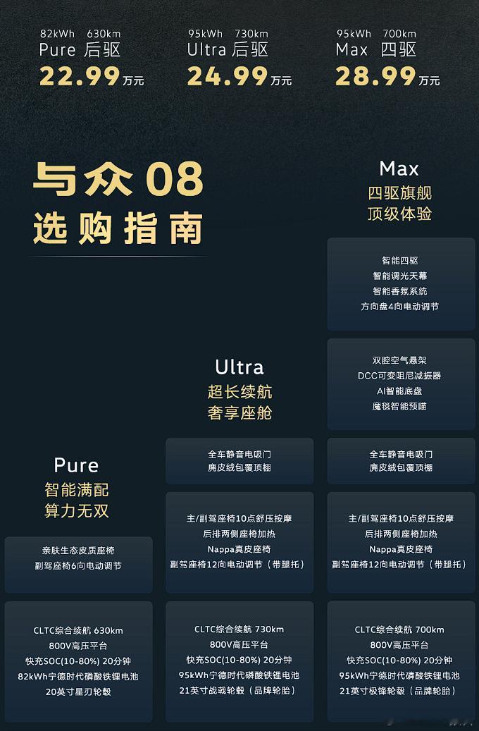 动力方面,与众08基于800V碳化硅平台打造,提供后驱和四驱两种动力,前者最大功率230千瓦;后者增设最大功率140kW的前电机,综合输出功率370kW,0-100km/h加速时间4.9秒,最高车速200km/h。