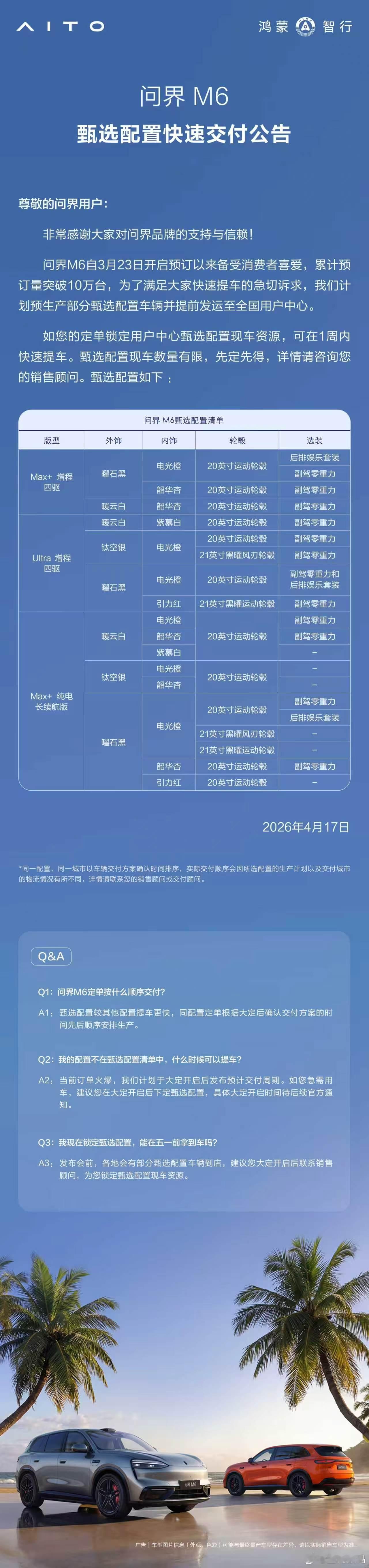 问界 M6 甄选现车涵盖 Max+ 增程四驱、Ultra 增程四驱、Max+ 纯电长续航三个版本的多种配置车型。