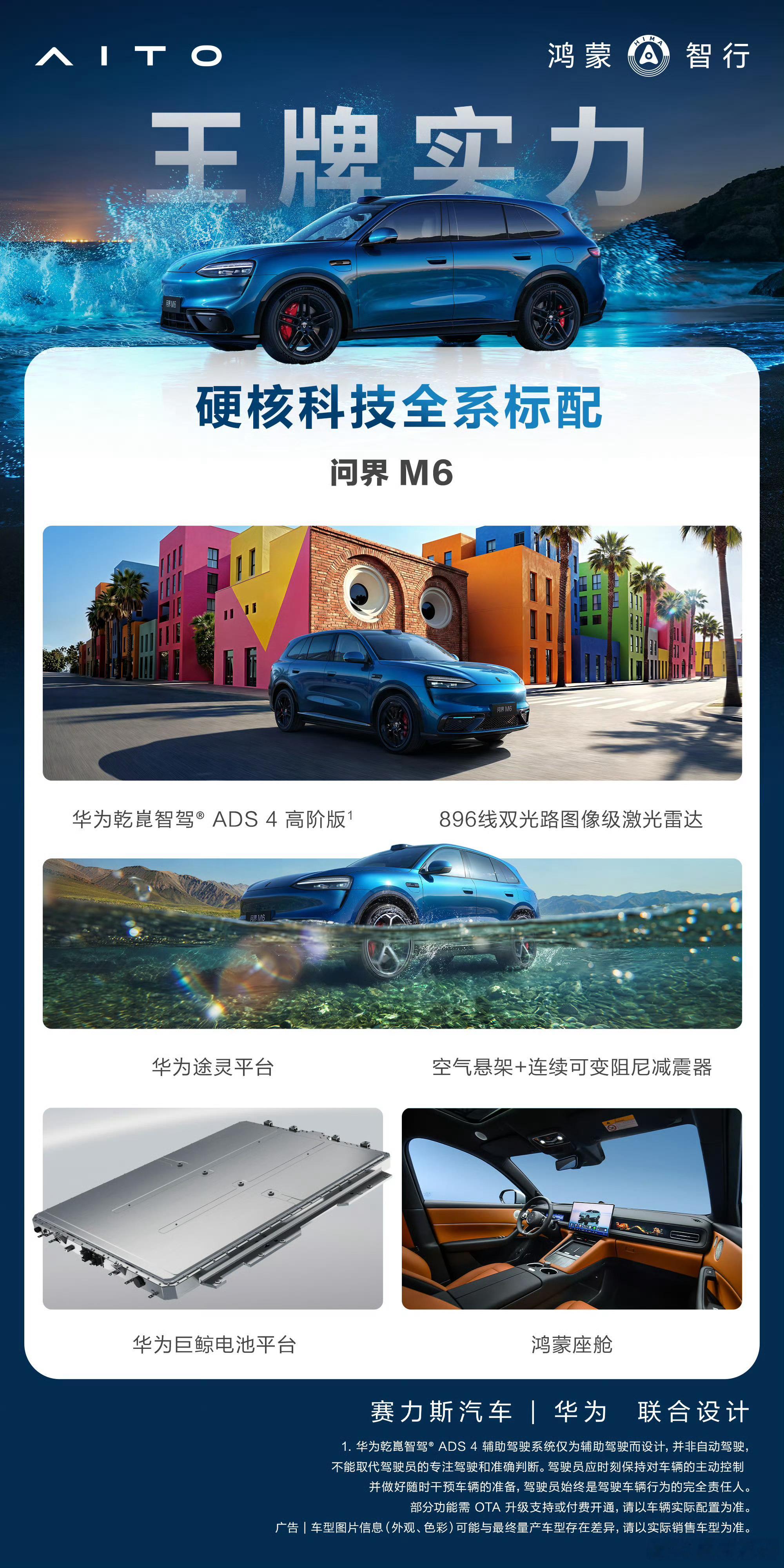 智能驾驶方面,问界 M6 全系搭载华为新一代 896 线图像级激光雷达(前向 + 后向固态雷达),配合华为 ADS 4.1 系统及 30 个感知硬件,可实现超高清、超远距障碍识别(如百米外小狗摇尾巴等细节动态)。