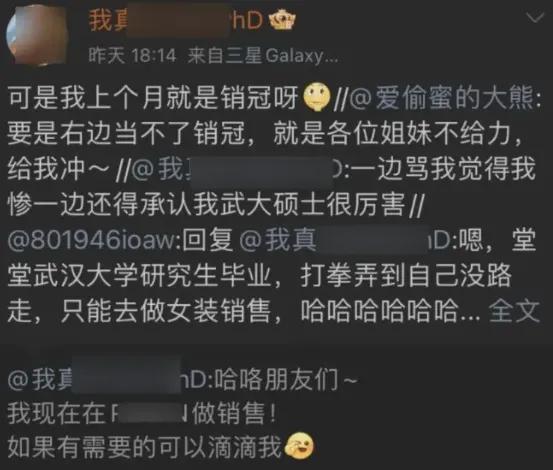 杨小姐是真能折腾!前脚刚因为假考上公务员被群嘲,后脚就高调宣布自己成了女装店销冠。 九折、包邮、无理由退货,吆喝得那叫一个卖力。生怕别人不知道她在哪上班,直接把品牌账号当成了自拍基地。 结果呢?网友瞬间冲了品牌账号,举报点到手软。平台秒通过,品牌方吓得连夜清空内容,客服忙不迭道歉:“线上线下不互通啊亲!” 更狠的是,有投融资经理直接联系商场领导,提醒此人重大舆情风险。高德地图上,门店已经被玩梗差评淹了!试条衣服就被诬告了。 法院判决早下了,武大图书馆事件本该翻篇。她偏要隔三差五跳出来,疯狂试探公众底线。 有人问她:“不读博了?”她用英文ID回复“我真的很想读博”。一边高调卖衣服引火力,一边暗示还要考公考编。这套明修栈道暗度陈仓,玩得是真溜。 只是,把大众当傻子,把雇主当盾牌,这波操作下来,还有哪家单位敢要?流量反噬的苦果,最终还得自己咽。