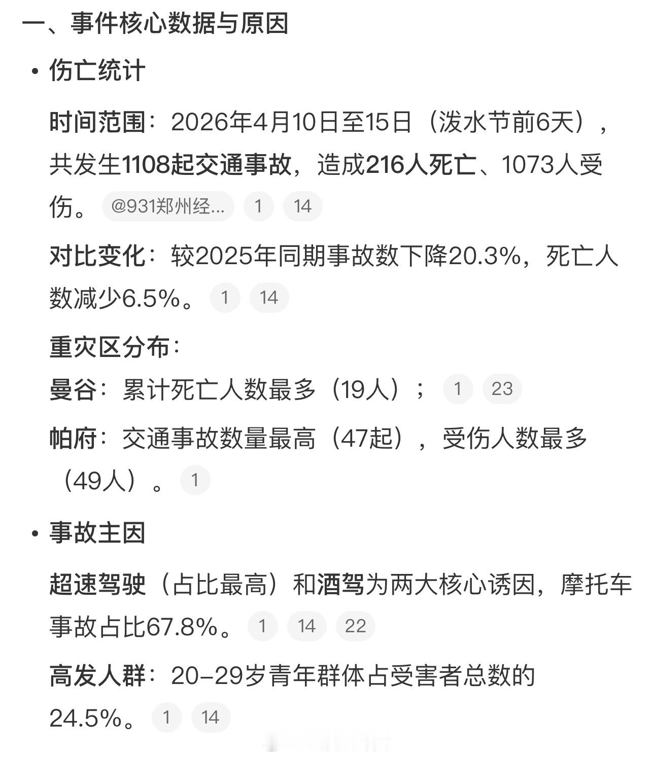泰国泼水节216人死亡4月10日至15日6天内,共报告1108起交通事故,造成216人死亡、1073人受伤