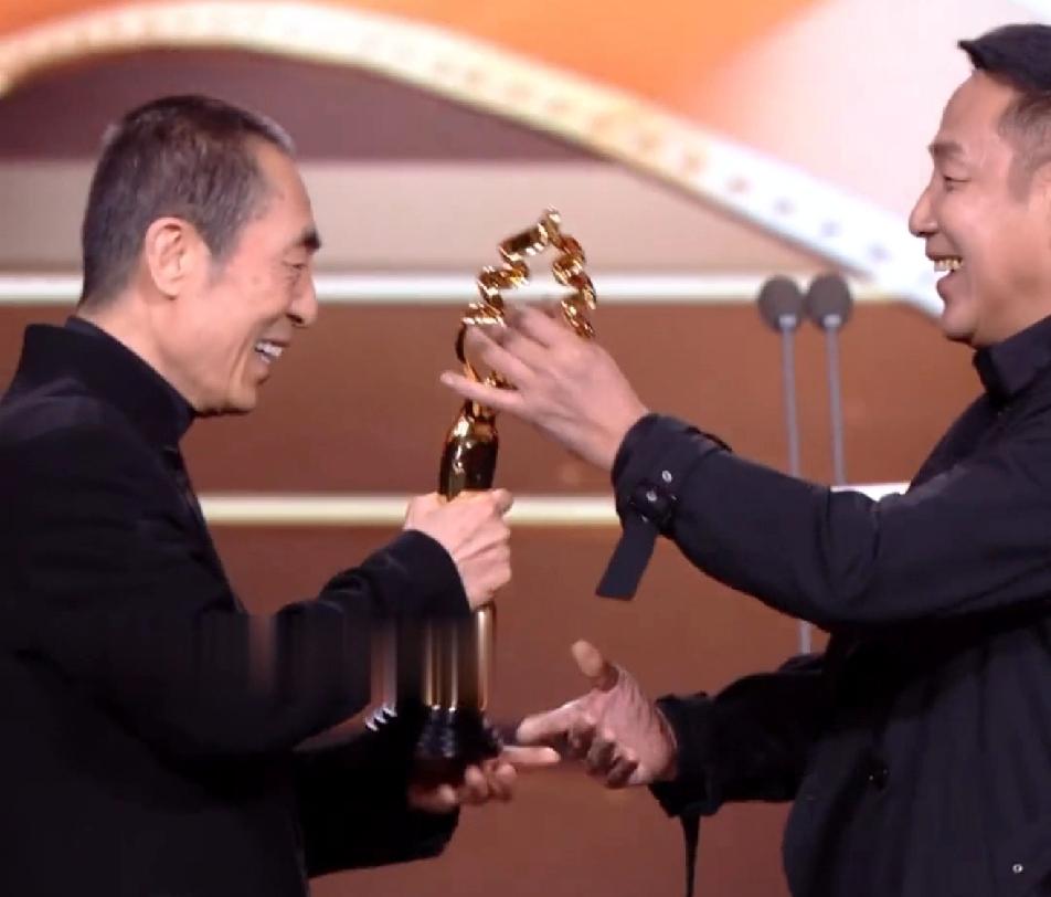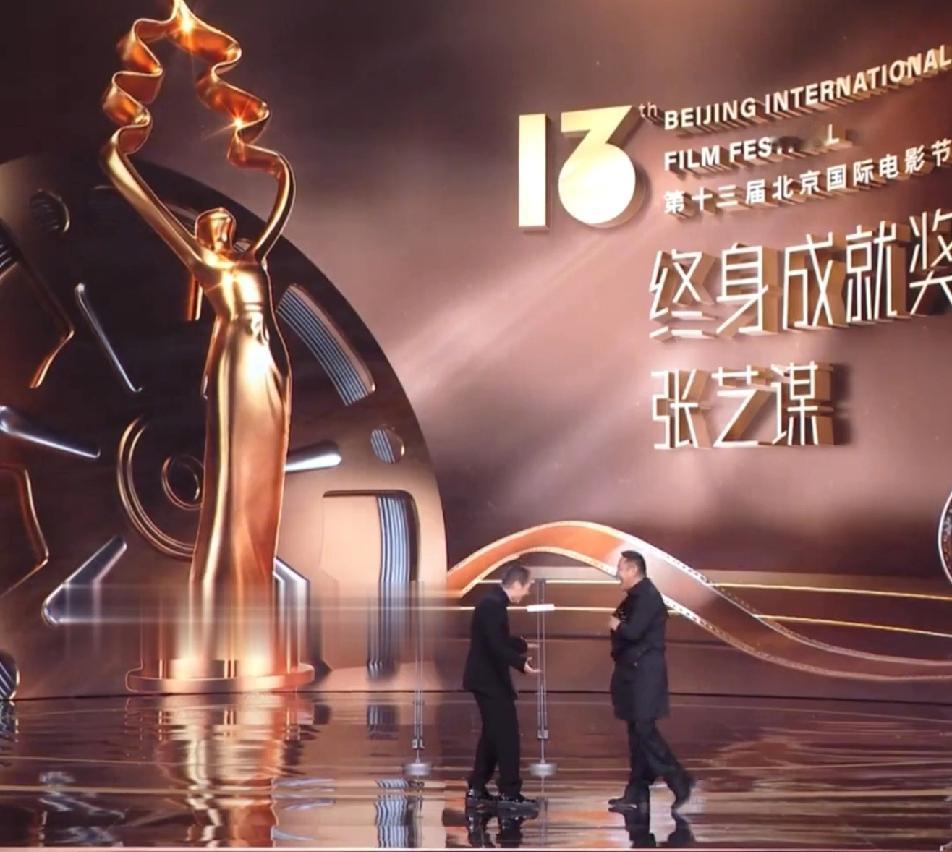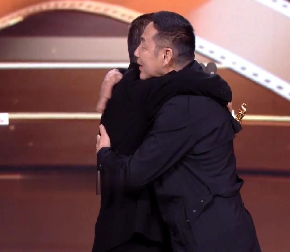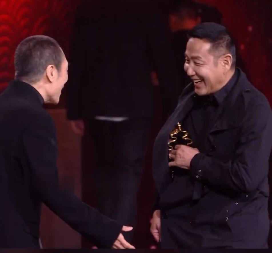 陈道明在张艺谋跟前这么可爱这么活泼的吗,张艺谋看着他挺着个大肚子上台,内心的os一定是:几十岁的人了能不能成熟点?但是张导情商高,还是配合陈道明演戏,看到陈道明从怀里掏出奖杯的时候装出惊讶的样子……一个导演圈的天花板,一个演员圈的天花板,此时此刻开心的像两个幼稚的小朋友!陈道明