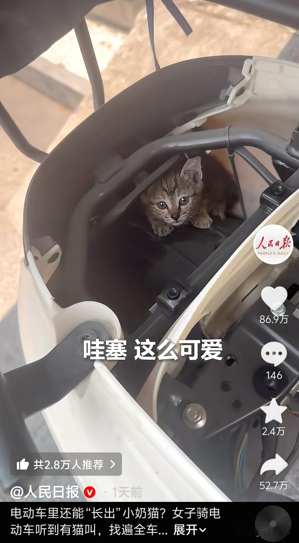 上人民日报了,广东,一女子骑电动车听到猫叫,可找遍全车都找不到,不料,这只找了那么久的小猫被锁在了电动车里,女子请了拆车师傅,终于把这只小猫解救了出来,小猫泪眼汪汪的看着女子,把她的心都给暖化了。 当天,女子下班骑电动车回家,刚骑没多远,就听见细细的猫叫。她一开始还以为是路边的野猫,没在意。 结果车一动,就又有“喵喵喵”的声音,车一停,声音马上就没了。反复了好几次,她才确定,声音就是从自己车上发出来的。 于是她在路边停下车,围着车子来来回回找了好几遍,车筐、座位底下、脚踏板、眼睛能看到的地方都找了,可连猫的影子都没看见。 没办法,她赶紧去找修车师傅,让他把车拆掉找猫。师傅慢慢拆掉了整个后座,终于在后座车架的空心横梁里看到了小猫。师傅直言,太不可思议了,根本不知道它是怎么钻进去的。 这时,小猫也抬起头,睁着水汪汪的大眼睛,好奇的看着女子,女子瞬间被萌化了,忍不住感叹:“哇塞,这么可爱呀!”最后,女子骑着电动车,带着小猫一起回家去了。 有网友调侃,这只小猫才是躲猫猫天花板,藏得太严实了,不把车拆开,根本找不到。而且行驶模式还自动播放猫叫声,停车模式一键静音,独家车载bgm,谁骑谁懵。 还有网友表示,真的很好奇,小猫到底怎么钻进去的,缝隙那么小,进去了还出不来,主打一个先进去再说,可把女子折腾坏了。 女子很善良,也很细心,及时发现了猫咪,还毫不犹豫就找师傅帮忙拆车,把猫咪救了出来,很暖心。师傅一点点拆开车身,救的不只是小猫,也是一份温柔。 小猫咪也很幸运,遇到了心软的好心人。世间的善意从来都很小,却特别治愈。女子愿意为缺少保护的小猫咪伸出手,愿意花时间解救它,这份心意很难得,也很美好,她朴素的善意值得被看见。