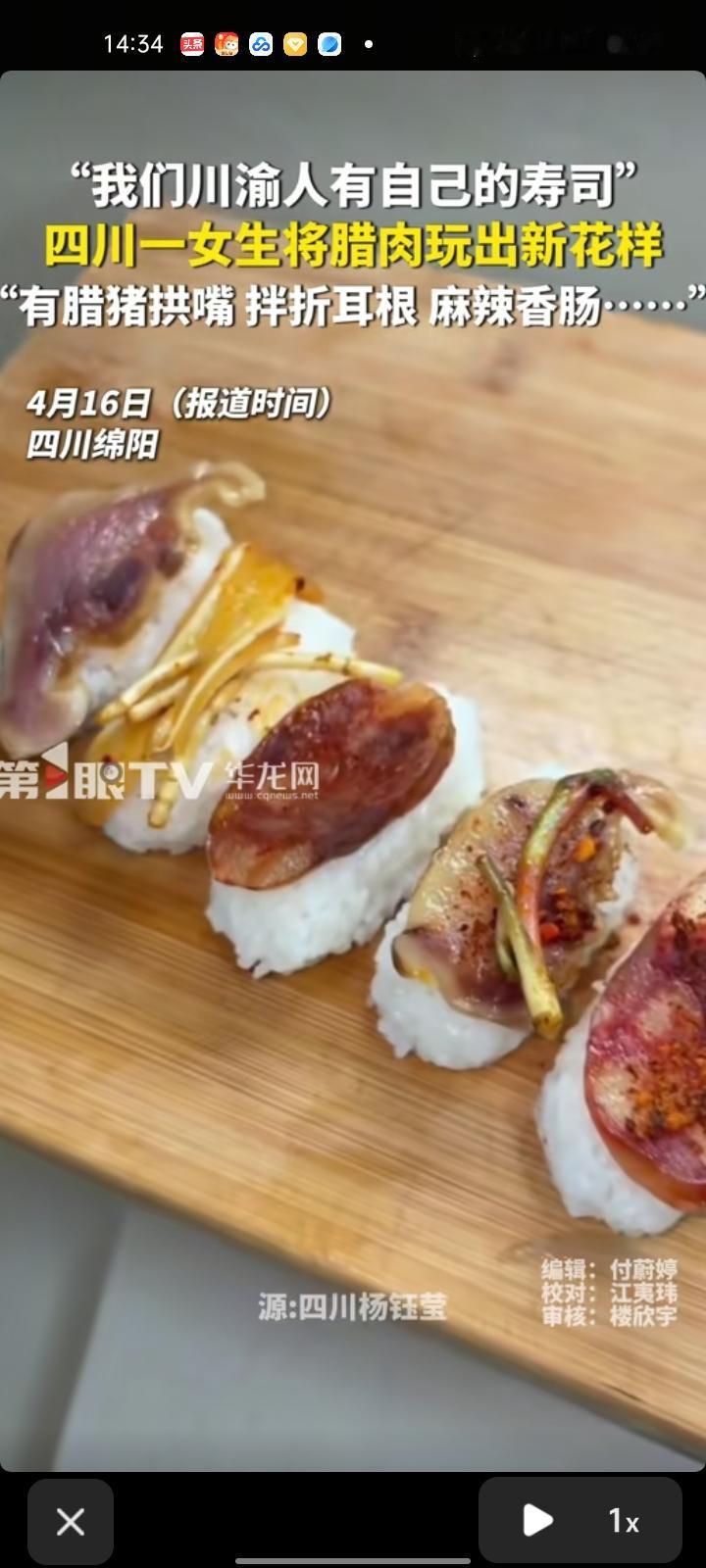 4月13日,绵阳市盐亭县。女生把腊肉玩出新花样,有腊猪拱嘴、拌折耳根等。 当事人徐女士表示,川渝人有自己的寿司,自家是做香肠腊肉的。某天,在外面吃寿司是,脑子里想出了寿司上加香肠的想法。这些寿司都是妈妈做的,吃了五六个就饱了。 说起这个寿司,当年我吃过,而且在广场上见过,有机会我试试看怎么做吧。