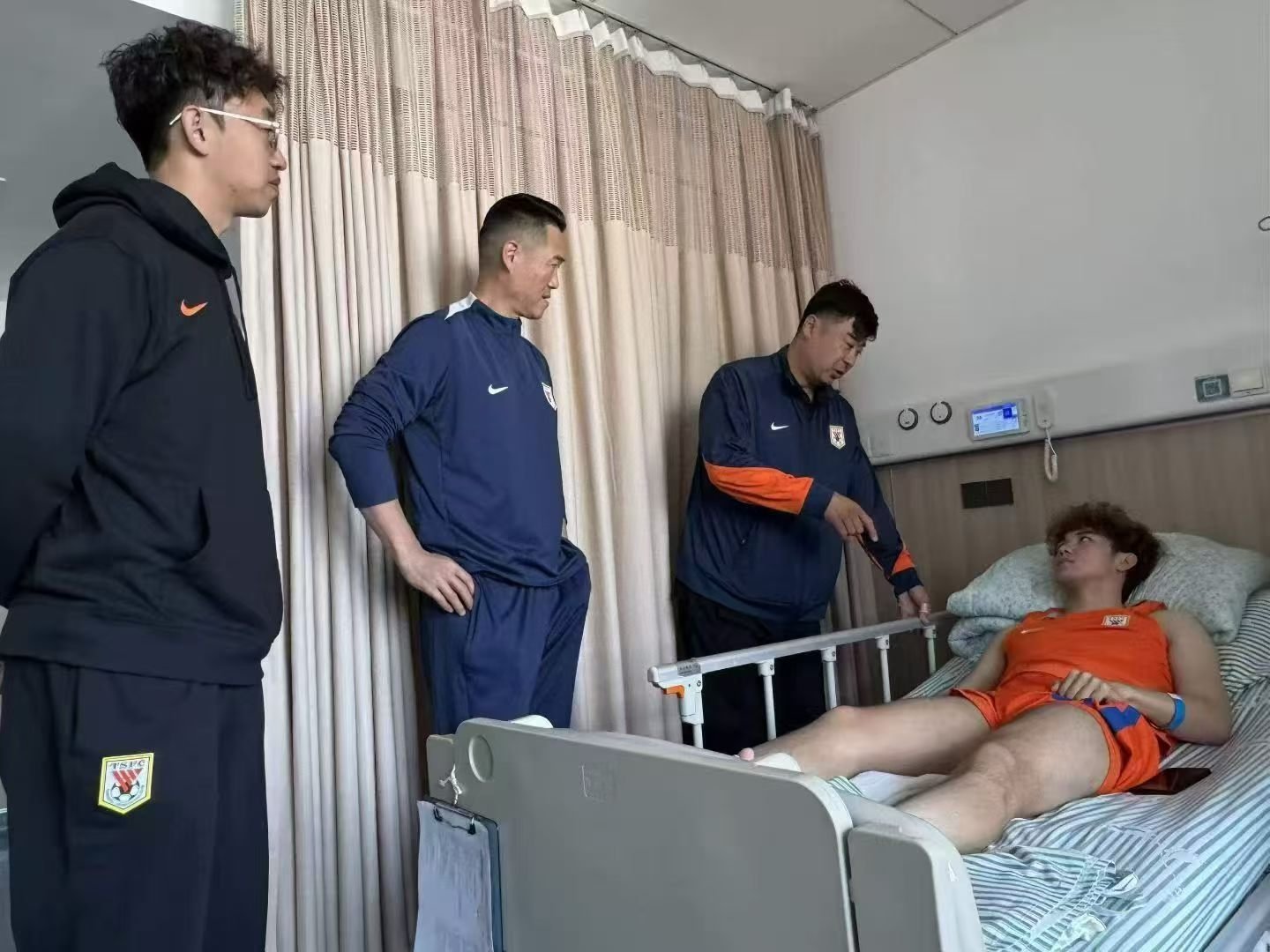 来源火神球迷会付会长发的照片:山东泰山足球俱乐部副总经理宿茂臻、泰山队执行主教练韩鹏指导来到医院看望重伤的B队球员艾孜海尔·塔西麦麦提。祝福他早日康复