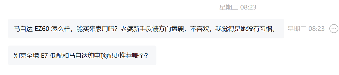 铁粉问:“别克至境 E7 低配和马自达纯电顶配更推荐哪个?”