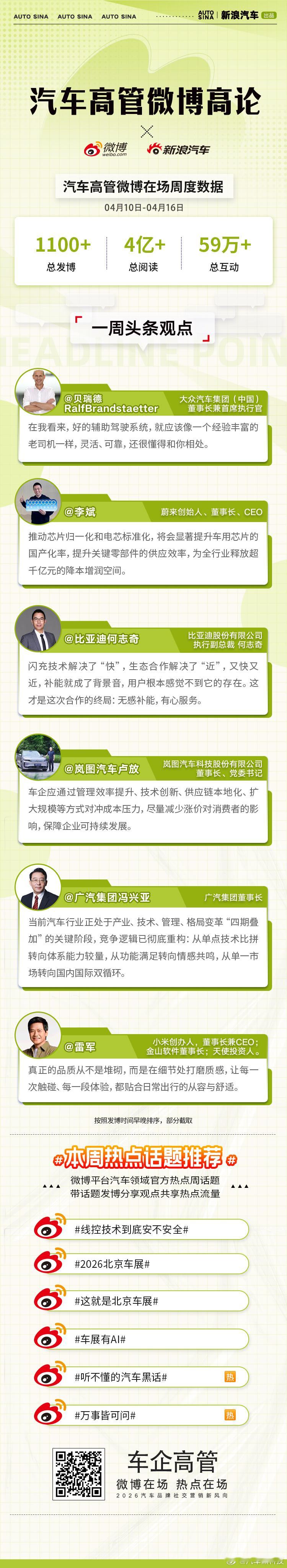 以智能技术降本提质,打磨出行质感,为用户带来舒适可靠的驾乘体验。汽车高管微博高论,省流速览微博一周高管精彩观点!