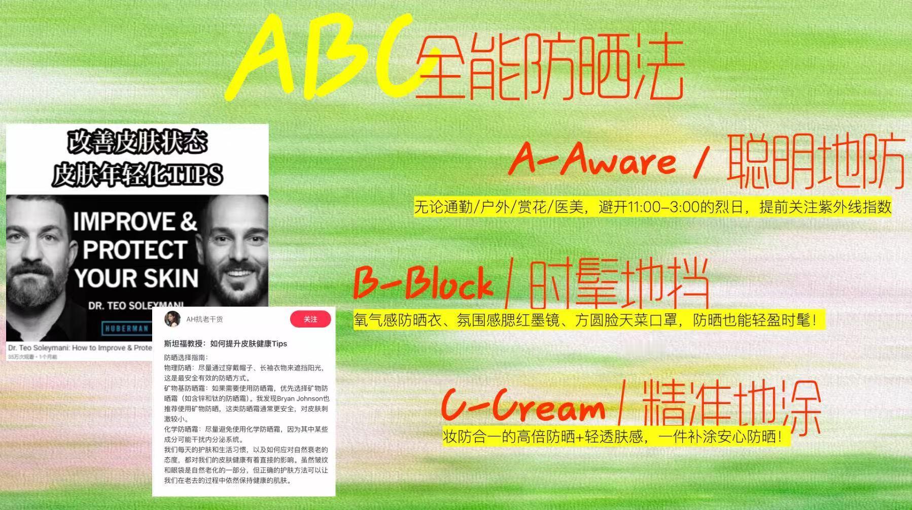 皮肤越黑越容易晒黑黑皮但不喜欢深肤色的的人天塌了,最近流行的防晒ABC三大法则,不就是姐妹们一直在坚持的吗?全副武装这一块~。A=Aware 聪明规避,主动避开强紫外线时段,从源头减少日晒伤害B=Block 物理遮挡,防晒衣、遮阳帽、墨镜加持C=Cream 精准涂抹,足量使用防晒霜,补足防护漏洞软硬结合双buff叠满,全天候全方位无死角防护。