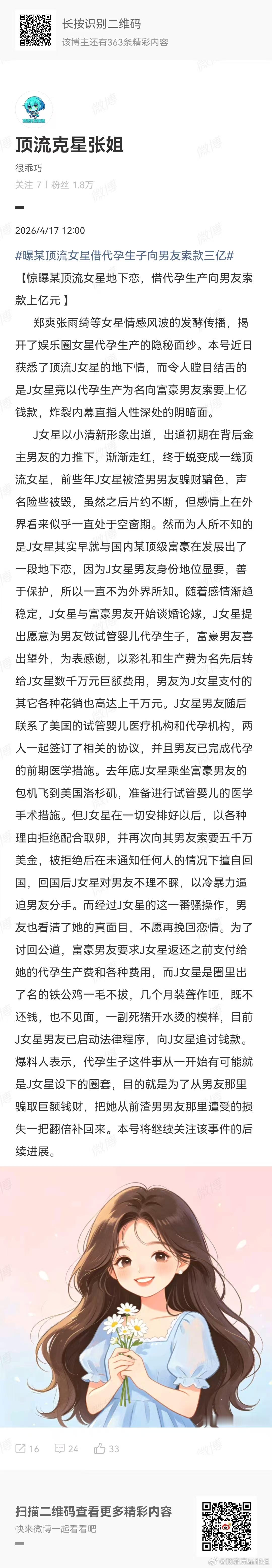 曝某顶流女星借代孕生子向男友索款三亿知人知面不知心