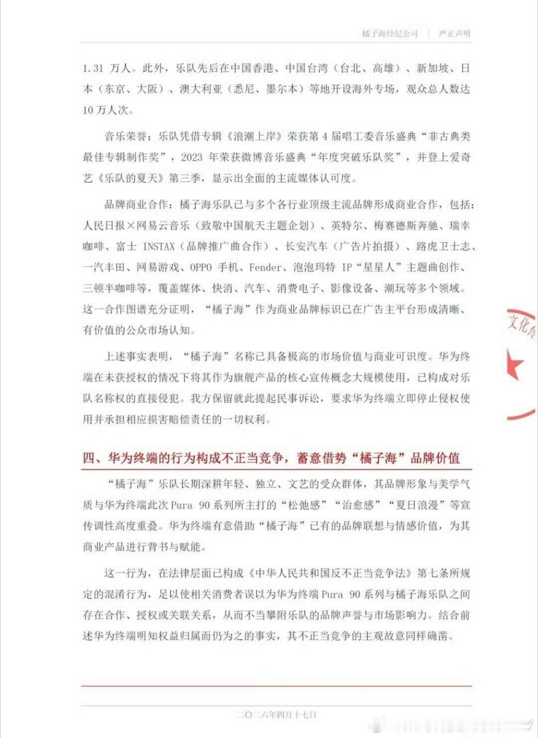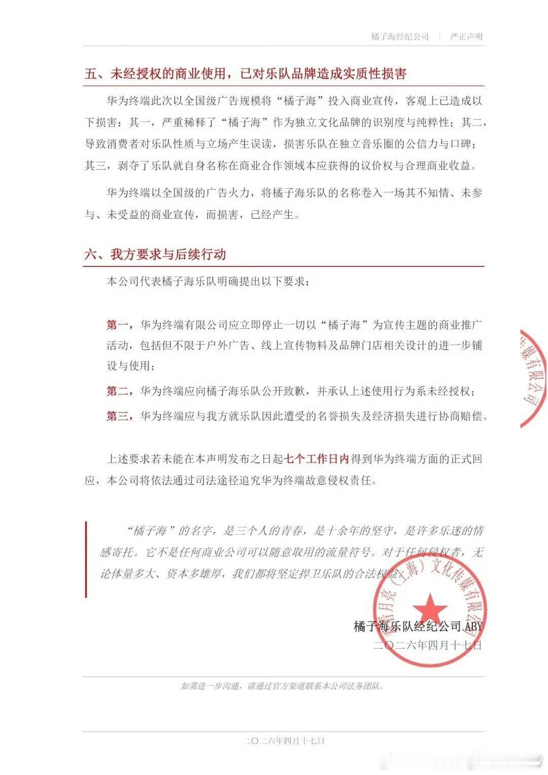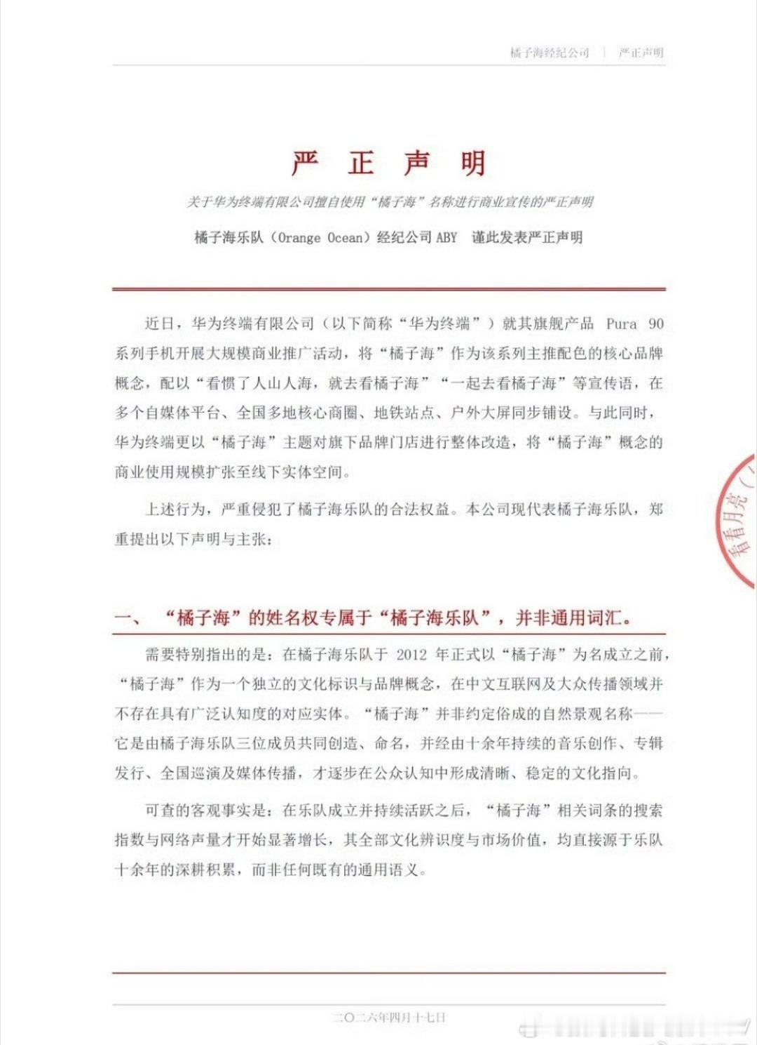 橘子海乐队发布严正申明,橘子海的姓名权专属于橘子海乐队,华为橘子海是借势橘子海乐队的品牌价值……