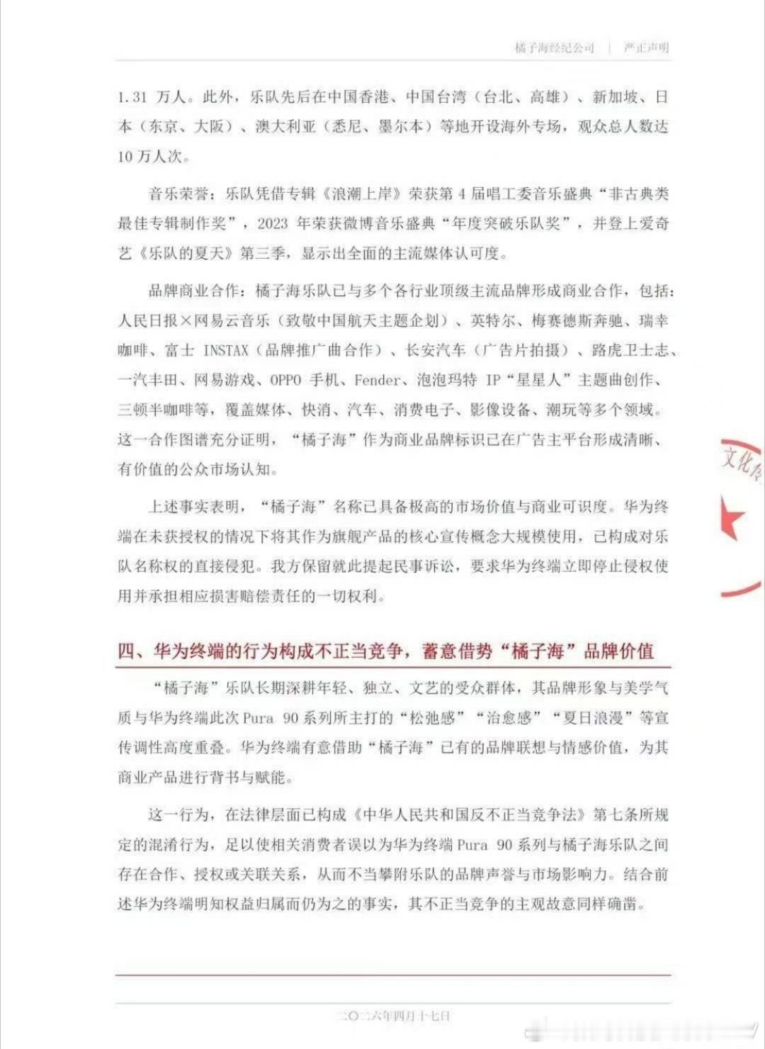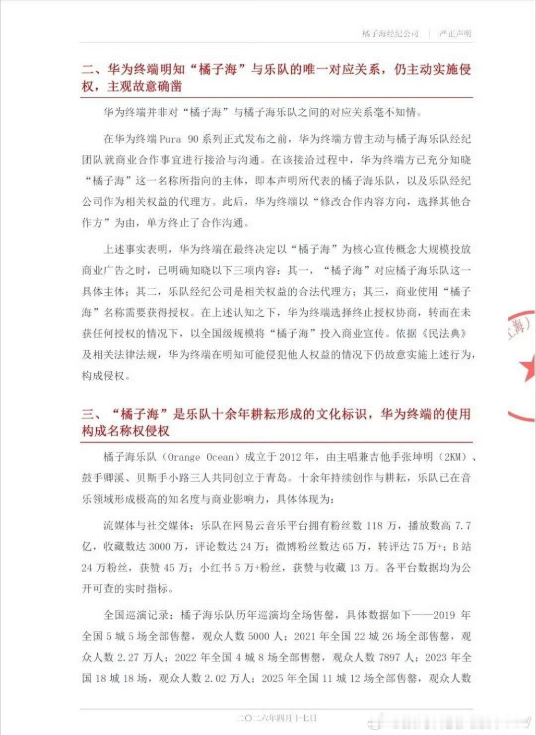 橘子海乐队发布严正申明,橘子海的姓名权专属于橘子海乐队,华为橘子海是借势橘子海乐