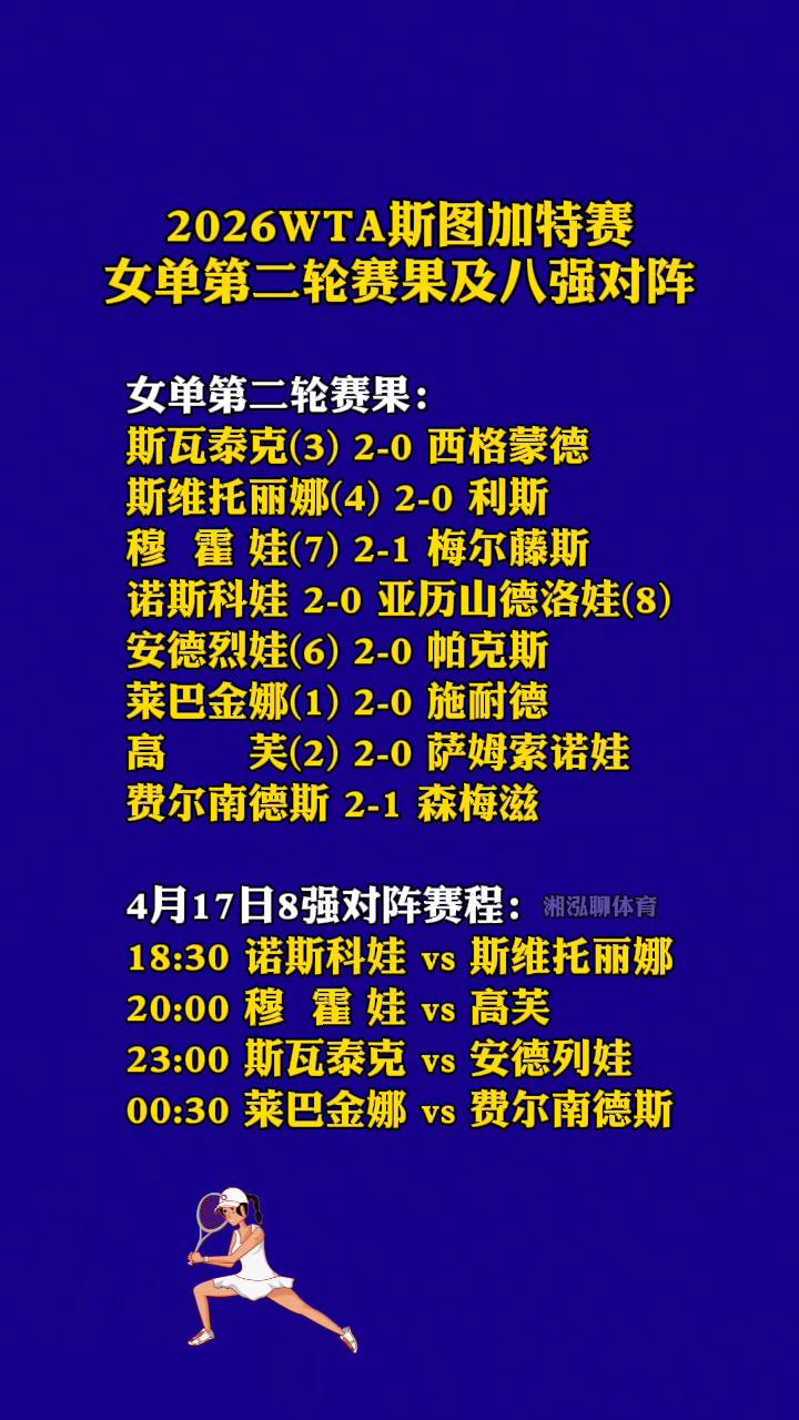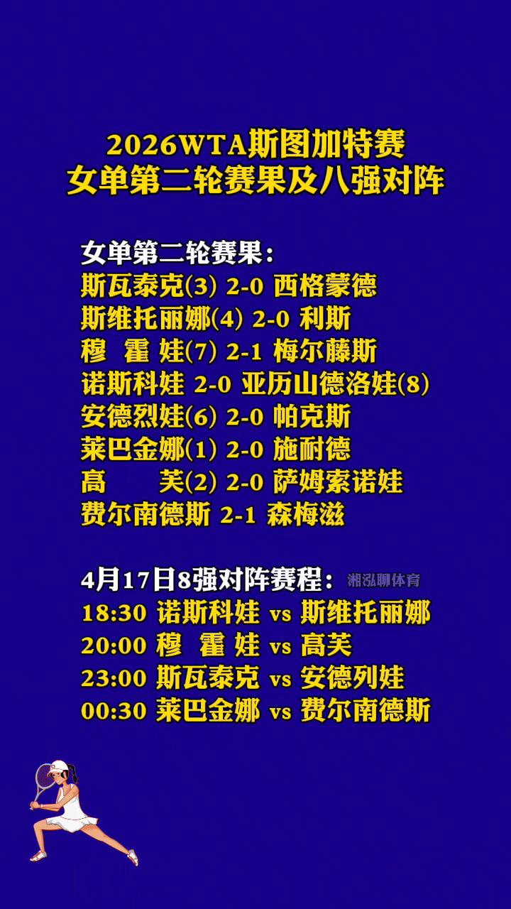2026WTA斯图加特赛女单第二轮赛果及八强对阵。 湘泓聊体育。 女单第二轮赛果:斯瓦泰克(3)2-0西格蒙德,斯维托丽娜(4)2-0利斯,穆霍娃(7)2-1梅尔藤斯,诺斯科娃2-0亚历山德洛娃(8),安德烈娃(6)2-0帕克斯,莱巴金娜(1)2-0施耐德,高芙(2)2-0萨姆索诺娃,费尔南德斯2-1森梅滋。 4月17日8强对阵赛程:湘泓聊体育。 18:30诺斯科娃vs斯维托丽娜。 20:00穆霍娃vs高芙。 23:00斯瓦泰克vs安德列娃。 00:30莱巴金娜vs费尔南德斯。