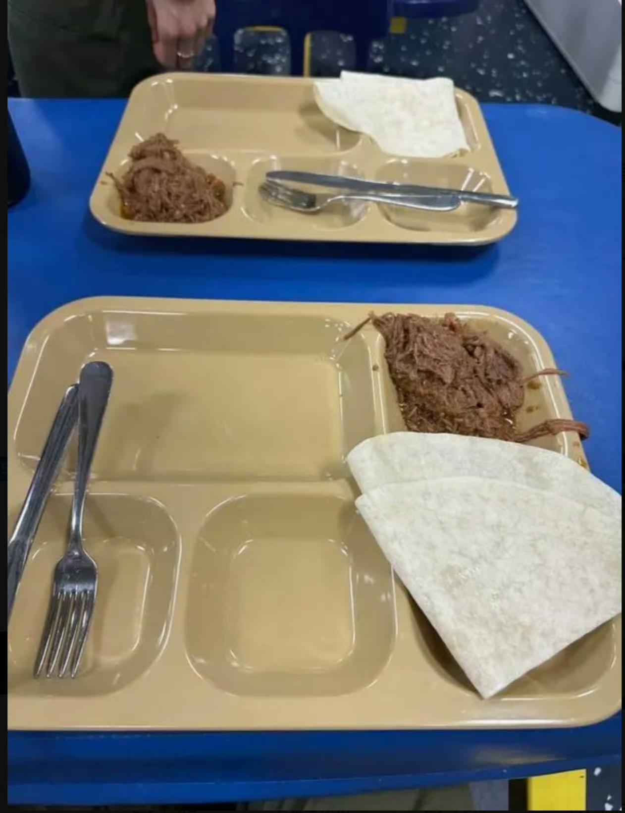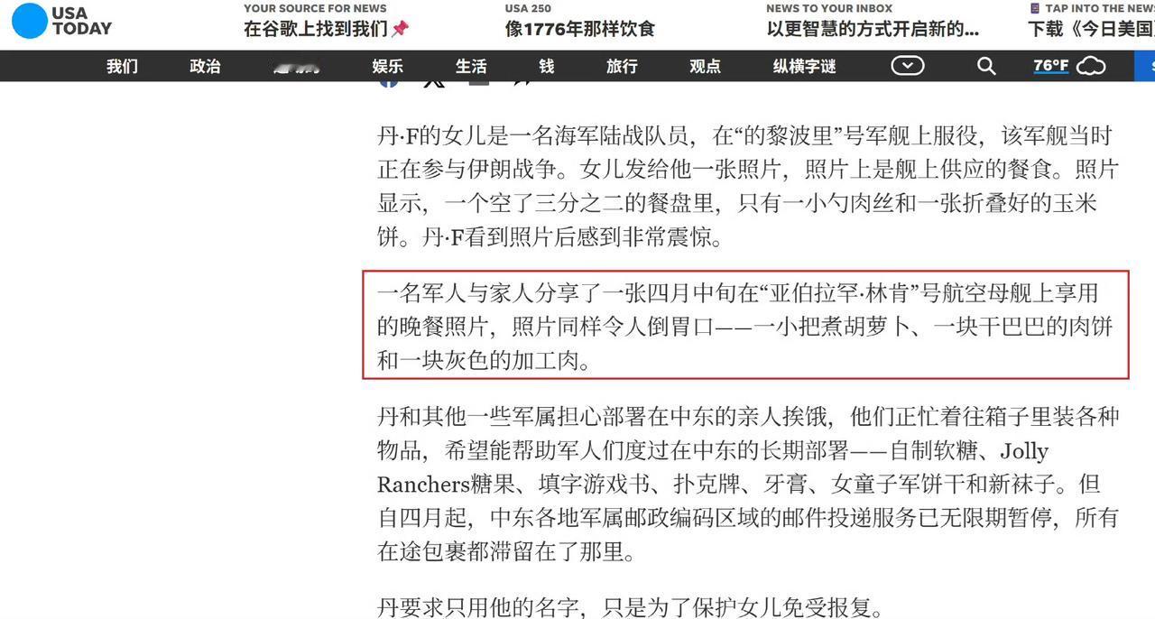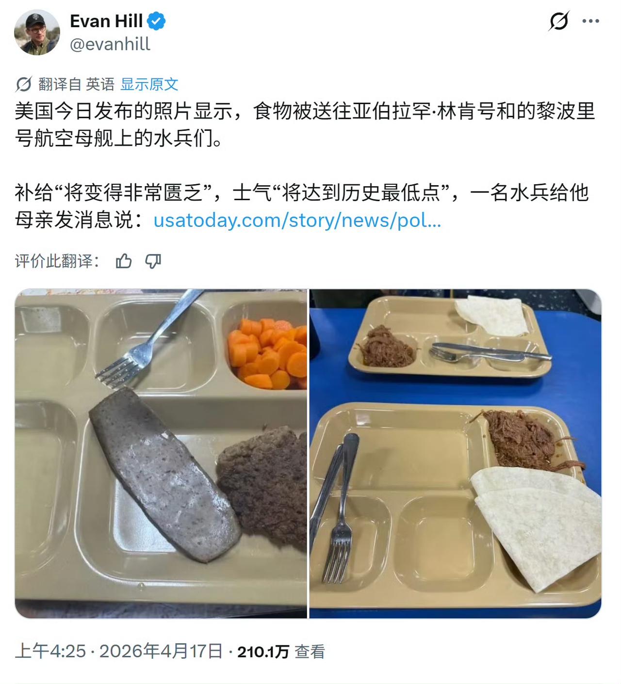 一位美军分享的林肯号航母上的日常伙食,一点胡萝卜,加工的肉以及肉饼,主食是烤面饼。不说能不能吃饱,在色香方面就差强人意。虽然美国人吃饭不大讲究,但是大块的肉也不够啊。在航母上作战,每天消耗那么大,精神高度紧张,都没配一点高热量、高蛋白质的饮食。就凭这一点营养,怎么能让士兵有充足的战斗能力。林肯号被派驻波斯湾执行任务,起先是航母卫生间发生堵塞,污水横流官兵怨声道载,紧急抢修后赶往霍尔木兹海峡执行任务,后勤却又拉胯了。舰上服役的士兵纷纷吐槽,有家属看到了他们的儿子、老公前线作战,吃的如此寒酸,纷纷想给他们寄一些家乡的特产,无奈美军航母暂时不靠岸,邮寄已经无限期暂停,他们没有办法,只能日日忍受这种清汤寡水的饮食。
