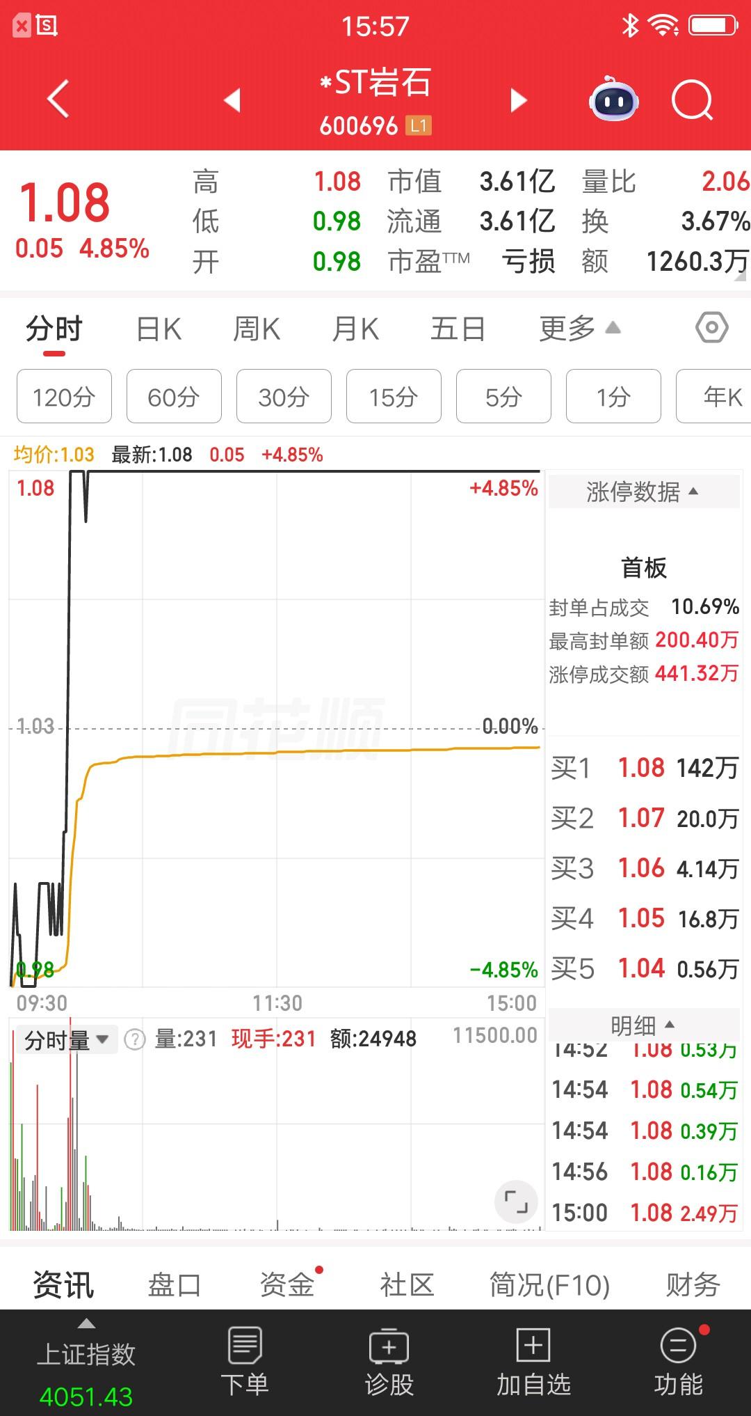A股今天唯一的地天板诞生了,该票竞价一字跌停,资金出逃意愿强烈,本以为彻底没戏了。没想到开盘后股价快速反弹,然后又跌回去了。万万没想到过了六分钟,股价再次弹起来了,这走势相当刺激呀。后面主力猛拉一波,直线涨停上演地天板。 大家要注意,该票是一只*ST股,十有八九要退市了,所以别被股价波动迷惑,一定要远离为妙呀。