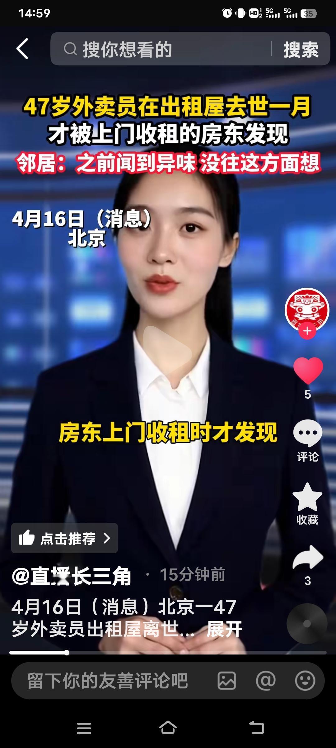 近日北京,发生了一件令人震惊的事情,47岁外卖员在出租屋离世一月才被发现,还是4月14日房东去收房租才知道的。 邻居:之前闻到异味,没往这方面想。他可能是突发心梗走的,邻居说这外卖员平时也不怎么和外人说话。一个月家人都没有和他联系吗?他应该上有老下有小吧,拼命跑单想多挣钱,结果却这么冷清地走了。据说,已通知家人! 其实像他这样的打工人不少,为了生活背井离乡,小病硬扛。每个人的人生都不易呀!在此,希望大家都能多关心身边人,也提醒在外打拼的人,别只顾赚钱,要爱惜身体。 外卖员之死 外卖员生存报告 送餐途中猝死 北京去世老人