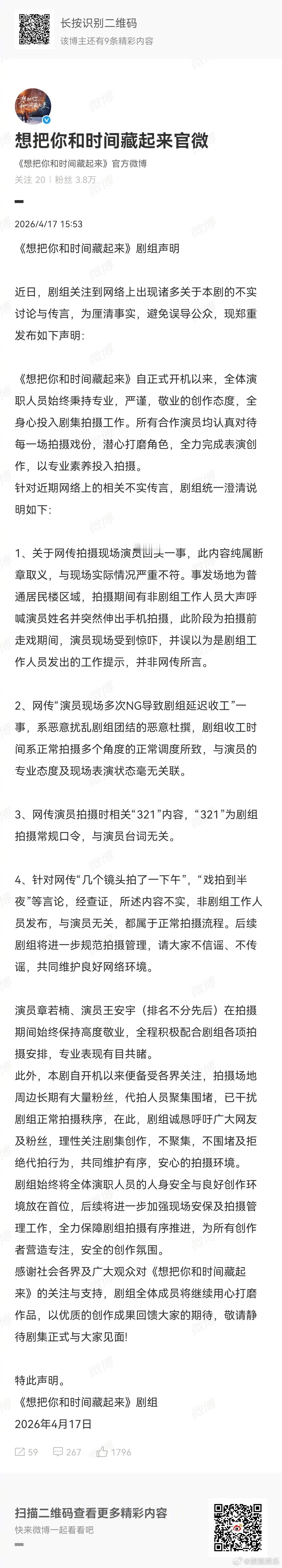 对此,《想把你和时间藏起来》剧组官微发布声明:“自正式开机以来,全体演职人员始终秉持专业,严谨,敬业的创作态度,全身心投入剧集拍摄工作。所有合作演员均认真对待每一场拍摄戏份,潜心打磨角色,全力完成表演创作,以专业素养投入拍摄。”
