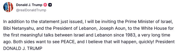 “我将邀请以色列总理比比·内塔尼亚胡和黎巴嫩总统约瑟夫·奥恩到白宫……双方都希望看到和平,我相信这将很快实现!”——唐纳德·J·特朗普总统 🇺🇸