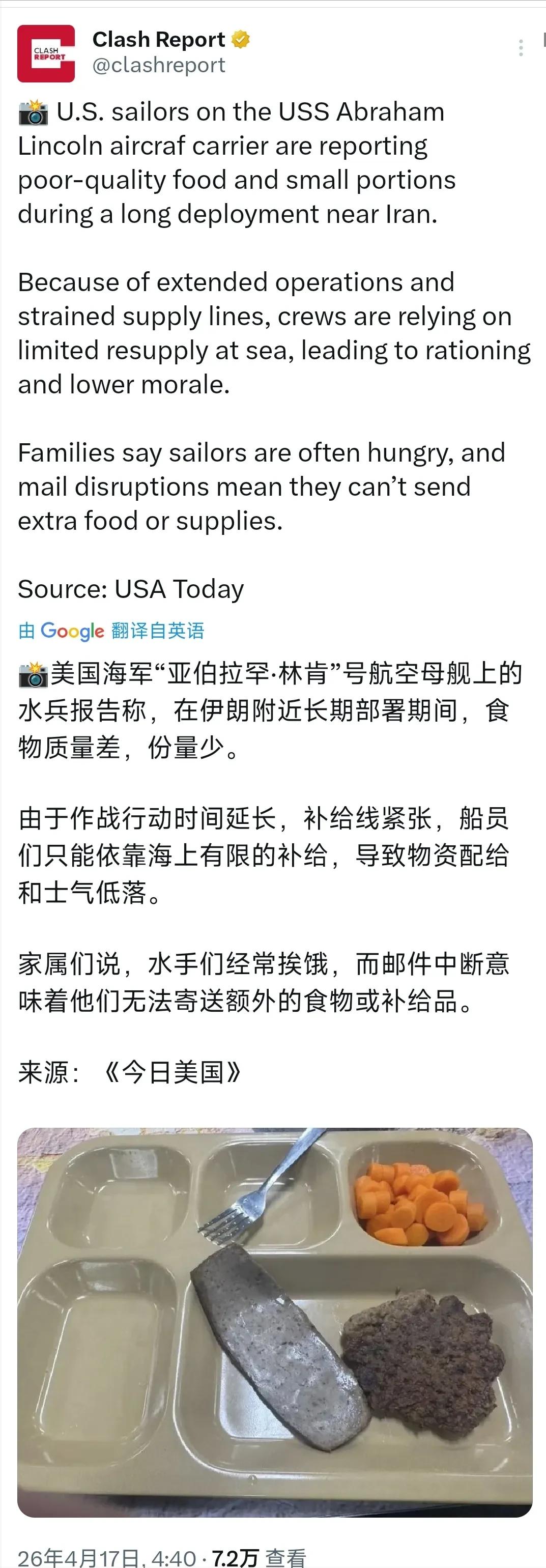外网疯传美军水兵餐照片,说好的牛排龙虾呢?真相扎心了 最近两天,外网社交平台上有两张照片彻底火了,不是什么明星八卦,也不是什么奇闻异事,而是美国海军水兵们自己偷偷爆料的“日常伙食”。没有华丽的摆盘,没有诱人的香气,只有两张寒酸到让人不敢相信的照片,看完之后,不少网友都在反问:这就是号称“全球最强海军”的水兵待遇? 第一张照片,来自的黎波里号两栖攻击舰——也就是咱们常说的“准航母”。照片里,一个硕大的餐盘里,三分之二的地方都是空的,只有一小勺碎肉,旁边放着一张对折的玉米饼,看起来干巴巴的,连点配菜都没有。很难想象,这就是在海上执行任务的水兵,一顿正餐的全部内容。 第二张照片更让人揪心,是亚伯拉罕·林肯号航母上的水兵餐。餐盘里只有几根清煮的胡萝卜、一块干瘪到发硬的肉饼,还有一片颜色发灰的加工肉,没有水果,没有主食,更没有传说中的营养搭配。要知道,林肯号可是美军尼米兹级航母的核心力量,常年部署在关键海域,可水兵们吃的,连普通快餐店的简餐都比不上。 相信很多人跟我一样,看惯了美军宣传里的水兵餐——大块的牛排、新鲜的龙虾、不限量的水果和饮料,甚至还有专门的甜品台。可现在这两张真实的照片,直接把这份“光鲜”撕得粉碎。 不少外网网友留言调侃:“说好的牛排龙虾呢?这是把水兵当难民养吗?”还有美军家属看到照片后直接破防,一位老兵的女儿就在的黎波里号服役,他坦言,自己当年服役时,再艰苦也能吃饱吃好,如今看到女儿吃这样的饭,心里既心疼又愤怒。 可能有人会说,是不是水兵们故意挑最差的拍,故意博眼球?其实不然,这两张照片不是个例,最近还有不少水兵在社交平台吐槽,舰上早就实行了严格的食物配给,新鲜的蔬菜和水果早就断供了,有时候连喝杯热咖啡都成了奢望,甚至有水兵说,自己每天都处于饥饿状态,分到稍多一点的 食物,都会和战友互相平分。 更让人无奈的是,不少美军家属想给孩子寄点零食、维生素,可美国军事邮政局从4月初就暂停了向中东地区军事基地的邮件投递,那些装满牵挂的包裹,只能堆在中转仓库里,根本送不到水兵手中。一位德州母亲为了给儿子寄物资,花了超过2000美元,最后却连包裹的影子都没看到。 其实大家不用疑惑,美军水兵餐之所以变得这么寒酸,根本原因不是美军没钱,也不是后勤部门不作为,而是高强度的作战任务,让他们根本没有时间进行补给。很多人不知道,航母补给从来都不是一件简单的事,不是补给船开过来,递上物资就完事。 根据美军的补给流程,不管是快速战斗支援舰,还是干货补给船,要给航母补给,都需要航母先退出战区,找到一个安全的海域停靠,而且这个停靠时间,至少要24小时以上。要知道,现在林肯号和的黎波里号,都在中东地区执行高强度的部署任务,参与对伊朗的海上封锁,根本不敢轻易离开岗位。 截至4月初,林肯号已经在中东部署了很长时间,为了避开伊朗的导弹威胁,甚至被迫后撤到印度洋深处,处于高度戒备状态。而美军现役的11艘航母中,有5艘正在外执行任务,3艘在港休整,3艘在厂维修,可用兵力本来就很紧张,根本没有多余的航母来替换它们,让它们能安心停靠补给。 有人可能会问,补给船不能直接开到战区附近补给吗?答案是不能。战区环境复杂,补给船没有足够的防护能力,一旦进入战区,很容易成为攻击目标。而且就算补给船强行靠近,也需要航母调整航线、减速配合,这在高强度的警戒任务中,几乎是不可能的——毕竟,航母的首要任务是执行军事部署,而不是停下来补给。 可能还有人不知道,美军航母打击群的物资消耗极大,正常情况下,每4到5天就需要进行一次大规模补给,而在高强度作战状态下,每2到3天就需要补给一次。可现在,林肯号和的黎波里号根本没有这样的补给窗口,只能被迫压缩物资消耗,首当其冲的,就是水兵们的伙食。 说穿了,这就是美军全球霸权背后的无奈。为了维持在各个地区的军事存在,为了推行自己的地缘战略,华盛顿的政客们把一艘艘航母推到前线,却忽略了那些在舰上卖命的水兵。他们嘴上喊着“重视士兵”,可实际行动中,连士兵最基本的吃饭问题都无法保障。 伙食的好坏,从来都不只是“吃不吃得好”的小事,它更是一支军队后勤能力、战斗意志的晴雨表。美军一直吹嘘自己的后勤体系全球第一,可这两张照片,却暴露了其后勤补给的短板——在高强度的军事部署下,所谓的“全球最强后勤”,也会显得捉襟见肘。 目前,面对全网的质疑和家属的不满,美国国防部和海军方面,至今没有给出任何正面回应。或许在他们眼里,水兵的伙食,比起地缘博弈的利益,根本不值一提。只是他们忘了,一支连士兵肚子都填不饱的军队,再强大的装备,也难以支撑起所谓的“霸权梦想”。