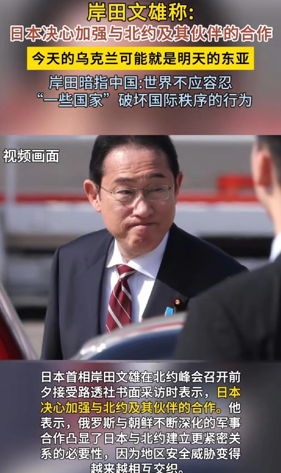 岸田文雄,扬言今日乌克兰可能明日东亚,又老调重弹!早在担任首相时,在美国国会演讲,在北约峰会接受采访等场合,多次反复就说,现在早不是首相了,只是一名普通国会议员,啥也不是了,北约代表团到日本来,岸田文雄能参会列席都不错了,还在会上刷存在感!为了迎合搞事早苗拍马屁?68岁一把年纪了,安安稳稳退休,别瞎叫了,否则像安倍晋三一样,害了自己!