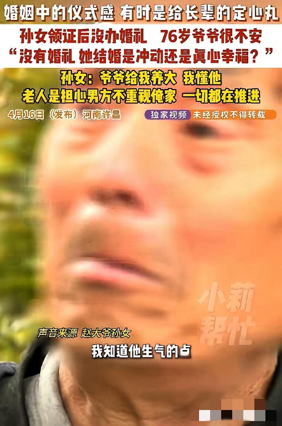 太心酸!河南禹州,20岁孙女偷偷领了证,没办婚礼,没通知家人,76岁的爷爷从别人嘴里知道后,当场落了泪。他不是怪孩子,是怕:“我都没见过男方,没有婚礼没有仪式,她结婚是冲动还是真心幸福?她爸妈不管她,从小我给她养大到18岁,我害怕她以后受委屈。” 从小跟着爷爷长大的孙女,是老人一手拉扯大的唯一依靠。可20岁的她,没穿婚纱、没戴戒指,连最亲的爷爷都最后一个才知道消息,悄悄把证领了。老人哭的不是孙女嫁了,是心疼她没被好好对待,连个正式仪式都没有。 有人说孙女长大了该自己做主,可咱没站在爷爷的位置想过。他要的不是彩礼钱,而是一个态度。他要的是男方一句承诺,让他知道这个捧了18年的宝贝,是被珍视、有名有分地嫁出去的。仪式不是排场,是爷爷心里最后的安全感。 孙女说在有序推进,可她没懂,爷爷要的不是婚礼多盛大,是一份“被看见”的尊重。婚姻可以简单,但不能让养大你的老人,满心都是牵挂和担忧。 你觉得这事儿,是孙女考虑不周,还是爷爷太传统?来评论区聊聊你的看法。