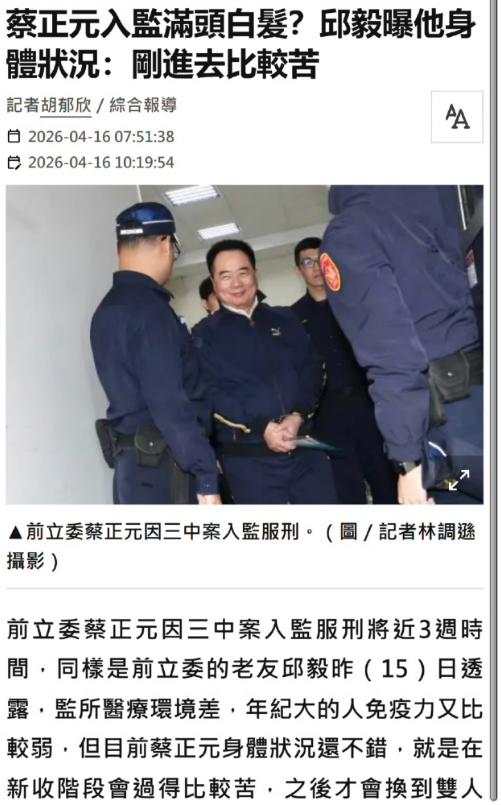 蔡正元进去服刑不到一个月时间,邱毅去探望了,得到的消息是,蔡正元在里面还是相当受苦的,邱毅也感同身受。 3月27日,蔡正元主动前往台北地检署报到入监,到4月15日邱毅完成探视,前后不过19天,连一个月都没到,可这位昔日在政论节目里侃侃而谈、意气风发的前民意代表,状态已经和入监前判若两人。 邱毅在政论节目里说起探监的所见所闻,语气里满是唏嘘,最让人意外的,是蔡正元的头发几乎全白了。要知道,入监前蔡正元还每天赶通告、上节目,对外形象一直打理得很妥帖,短短十几天的牢狱生活,就让他有了这么直观的变化。 比头发变白更磨人的,是监所里的居住环境。按照台湾地区监所的规定,刚入监的人员要先度过两到四周的新收观察期,这段时间里没有床铺提供,所有人都要睡水泥地板。 蔡正元待的新收房,地板早就年久失修,到处都是龟裂的缝隙,里面藏满了尘螨。人躺在上面,尘螨咬得人浑身发痒,只能不停去抓,一来二去身上的皮肤都抓破了。可狱方对此的处理,只是随手丢过来一管药膏,用了之后一点效果都没有,根本没人管他的实际情况。 因为入监前还在连轴转地上节目,蔡正元根本没时间提前准备生活用品,还是他的太太得知情况后,赶紧买了瑜伽垫送进去,垫在冰冷的水泥地上,才算稍微缓解了一点尘螨的困扰。 网上之前有传言,说蔡正元把监狱当成了讲堂,在里面照样给人讲课,邱毅也直接戳破了这个不实说法。他直言,这根本就是不可能的事,新收房里挤了很多人,连个人空间都少得可怜,日常作息全要按规定来,根本没有条件去做什么讲课的事,连安安稳稳休息都不容易。 除了住得差,新收期里的各种限制,也让习惯了自由的蔡正元很难适应。这段时间里,他不能看电视,没法接触外界的新闻信息,就连家属和朋友的探视,也只有短短15分钟的时间,全程还要被录音。大家常说的家属送会客菜,更是要等新收期结束,分到正式的两人间牢房之后,才有资格申请。 邱毅说,蔡正元今年已经70多岁了,年纪大了免疫力本来就弱,监狱里的医疗条件又差,一点小病小痛都得不到妥善的照顾,再加上作息和环境的巨大变化,身体和心理都承受着不小的压力,状态自然远不如在外面的时候。 看着好友落得这般处境,邱毅的感同身受,不止是因为这十几天的牢狱之苦,更是因为他清楚,蔡正元今天的遭遇,从头到尾都带着浓浓的政治操弄色彩。 让蔡正元被判3年6个月有期徒刑的,是已经缠讼了7年的“三中案”。当年国民党深陷财务危机,是蔡正元临危受命,操盘中视、中广、中影三家党营媒体的股权交易,帮国民党渡过了难关,这笔交易当年也经过了检调核查,并没有认定存在违法问题。 可2016年民进党上台之后,直接把这桩尘封多年的旧案翻了出来,一场旷日持久的司法拉锯战就此拉开。最终的结果更是让全岛哗然,同案被起诉的马英九等一众国民党高层,一审二审都被判处无罪,唯独全程操盘的蔡正元,被认定业务侵占罪成立,不仅要坐3年半的牢,还要承担2亿多新台币的没收责任。 对于这个结果,蔡正元从始至终都坚称自己问心无愧,直言这就是民进党当局针对他的政治追杀。毕竟这么多年来,他一直是岛内敢公开硬刚“台独”势力的代表人物,多次尖锐批评民进党当局的错误政策,还曾公开反驳赖清德美化日本殖民历史的荒谬言论,早就成了绿营的眼中钉。 入监当天,面对赶来送行的支持者和围堵的媒体,蔡正元全程面带微笑,还特意卷起裤腿展示自己的电子脚镣,说自己会以灿烂的笑容迎接政敌的打压,从容面对这场政治追杀。 可再坚定的意志,也扛不住实打实的牢狱磋磨。短短不到一个月的时间,昔日意气风发的评论员,就成了如今头发全白、睡在水泥地上饱受尘螨困扰的阶下囚,也难怪邱毅探监之后,会满心唏嘘,直言好友受了大苦。 而蔡正元的遭遇,从来都不是一个个例,而是民进党当局利用司法工具打压异见者的缩影。当司法沦为政治操弄的武器,最终被消耗的,只会是民众对公平正义的信任。