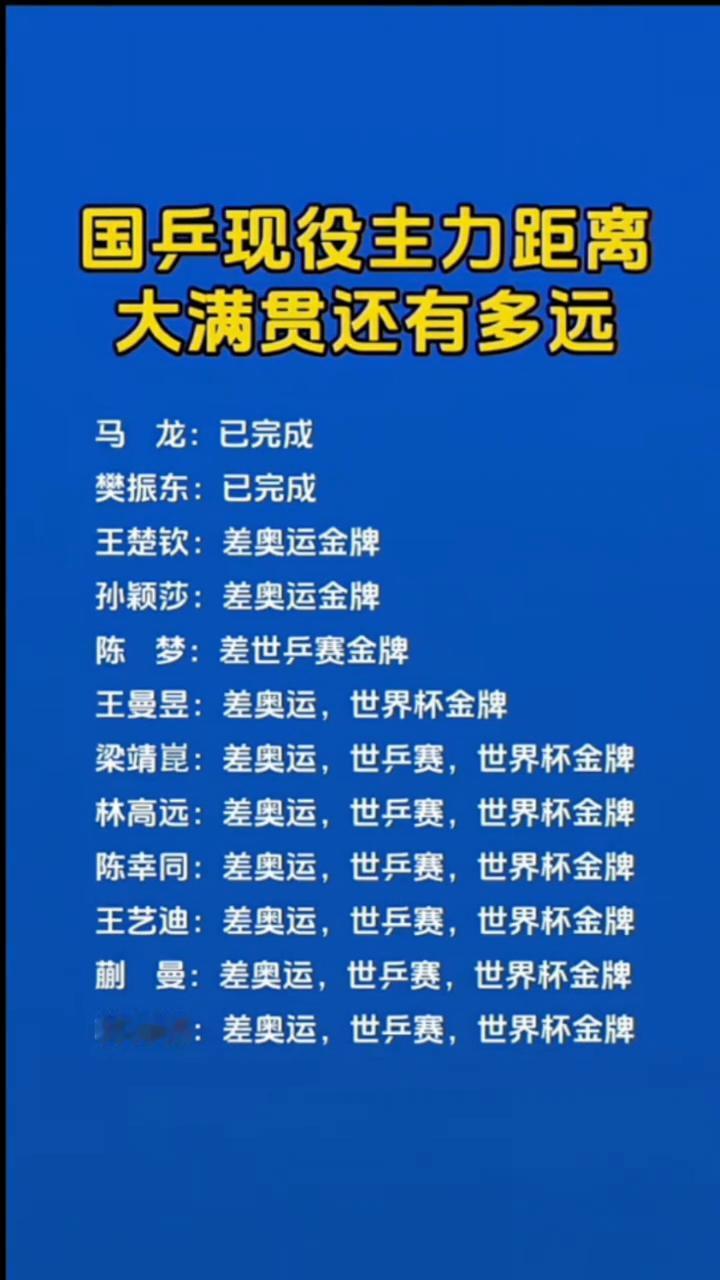 国乒现役主力距离。 主力距离推荐:大满贯还有多远? ·马龙:已完成。 ·樊振东:已完成。 ·王楚钦:差奥运金牌。 ·孙颖莎:差奥运金牌。 ·陈梦:差世乒赛金牌。 ·王曼昱:差奥运,世界杯金牌。 ·梁靖昆:差奥运,世兵赛,世界杯金牌。 ·林高远:差奥运,世兵赛,世界杯金牌。 ·王艺迪:差奥运,世兵赛,世界杯金牌。 ·蒯曼:差奥运,世兵赛,世界杯金牌。 ·林诗栋:差奥运,世兵赛,世界杯金牌。 ·陈幸同:差奥运,世兵赛,世界杯金牌。
